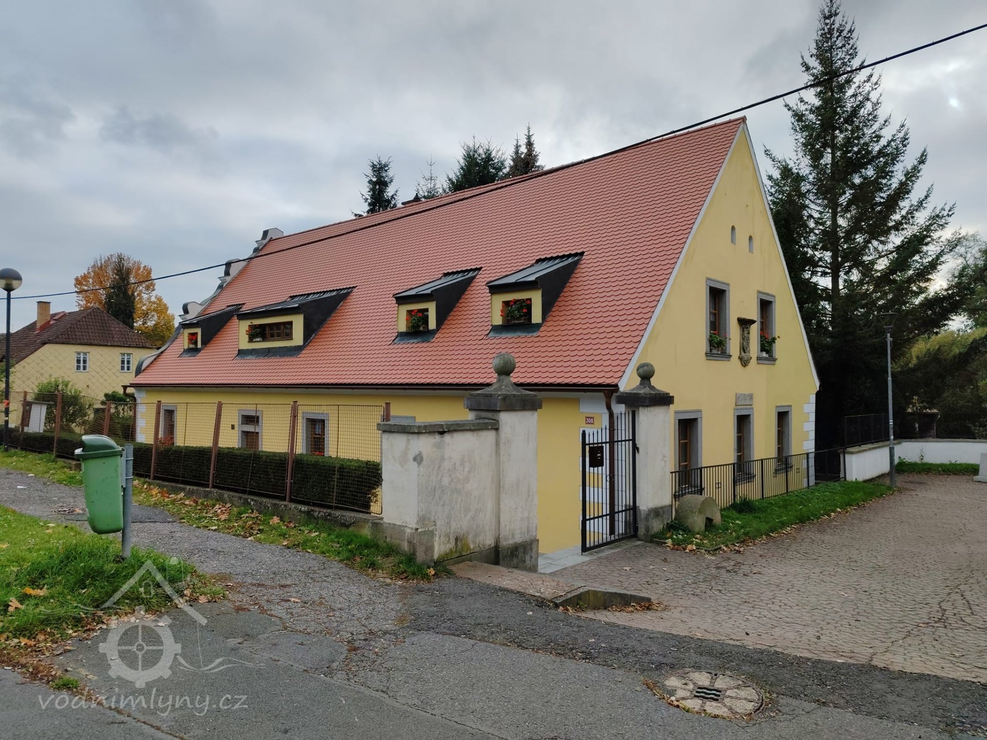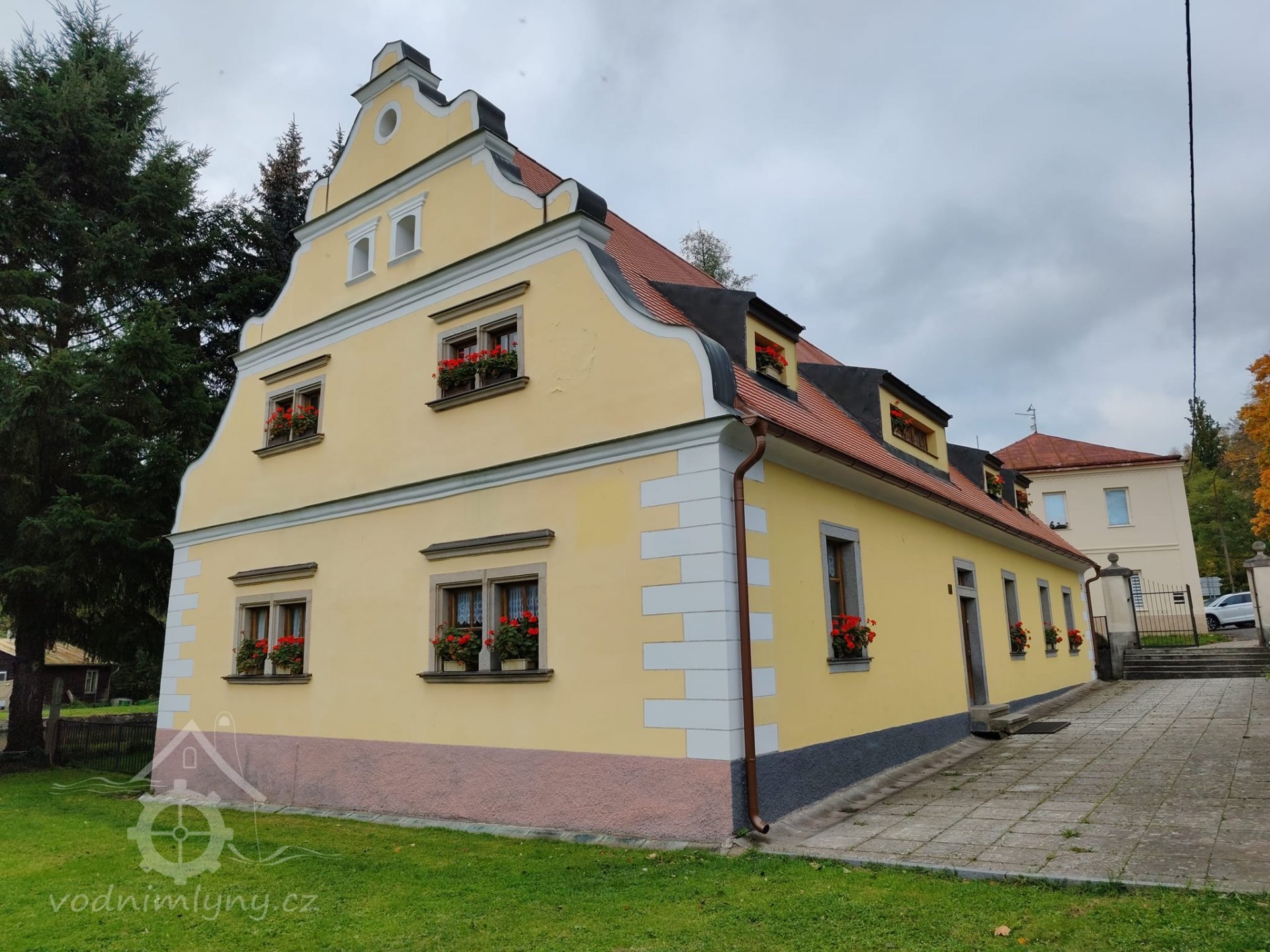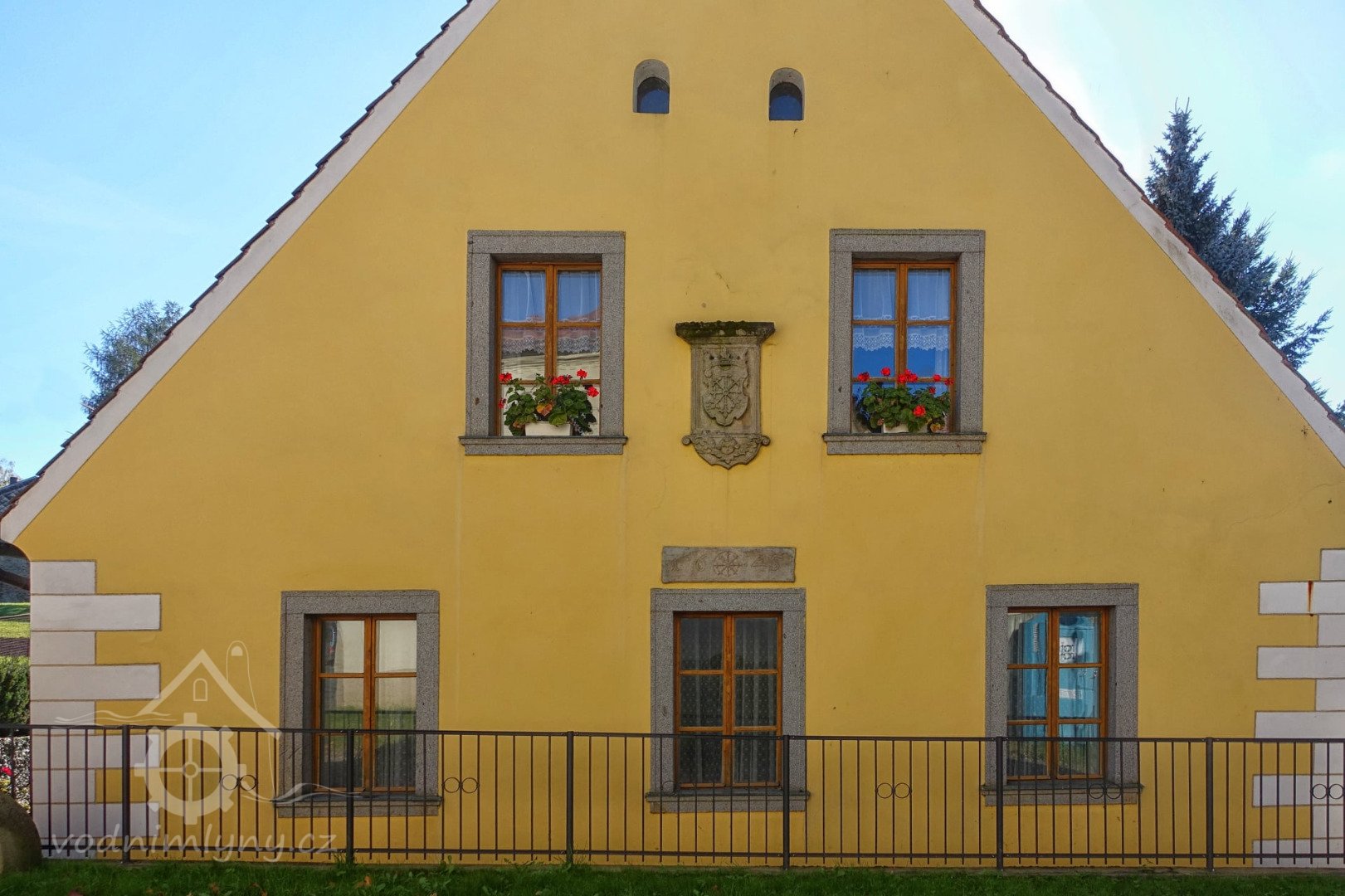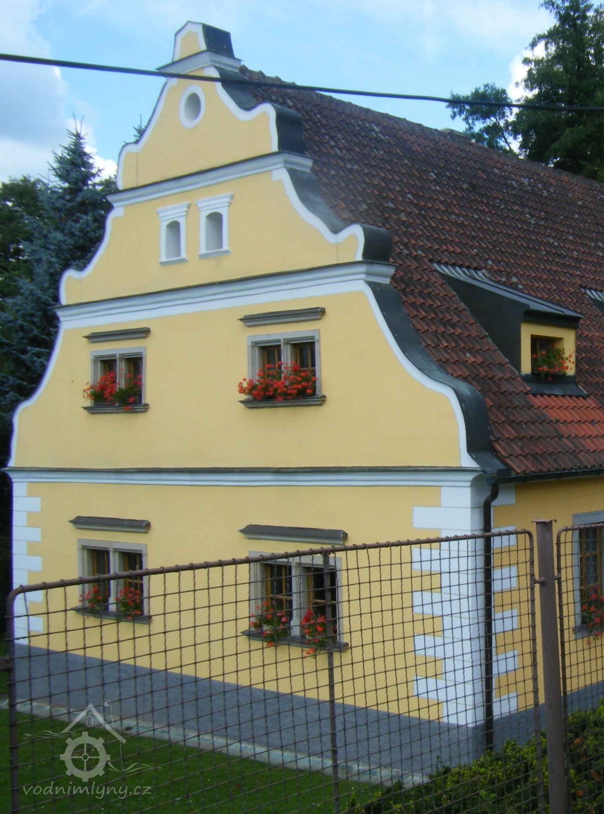 Mlýn je přízemní s vysokými zdobenými štíty.