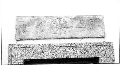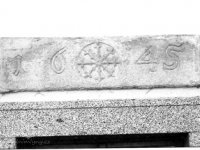 2) pod ní obdélný kámen s letopočtem 1645, mezi číslicemi kruh se stylizovaným znamením Jana Filipa Husmanna. Patrně část překladu dveřního portálu.