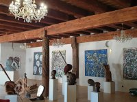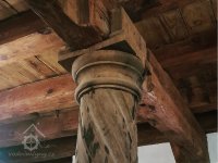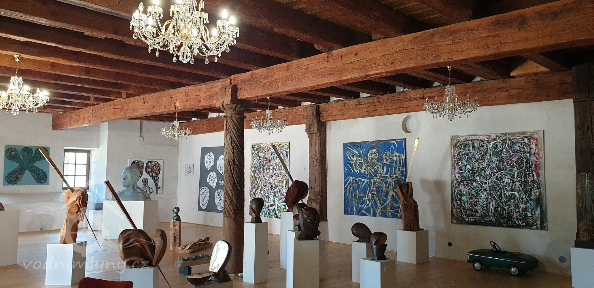 Výstavní síň ve mlýnici, 05 2024, © Ivana Veselá, (Prvky na obrázku: tesařsky zdobené podpůrné sloupy, trámový strop)