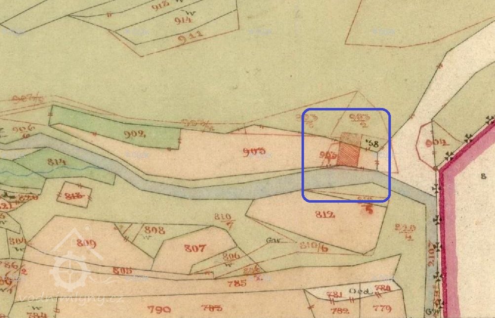 Mlýn byl původně vystavěn bez stodoly, pouze obytné stavení s místnostmi pro mlýnský stroj. Pro užívání vody ze Všehrdského potoka vznikl v tomto roce spor.