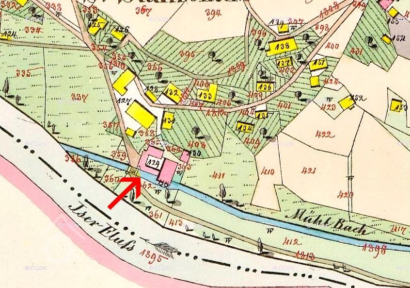 Mlýn stojí 180 metrů jihovýchodně pod kostelem sv. Stanislava v Loukově.