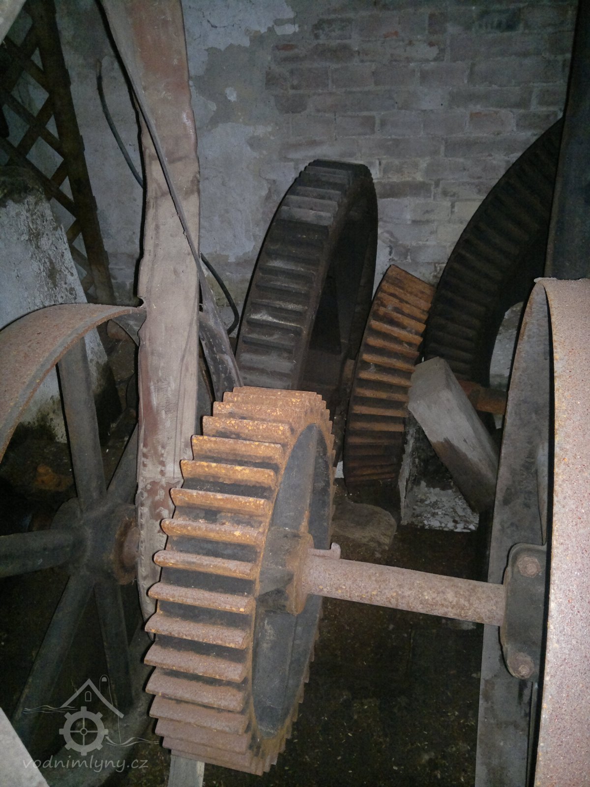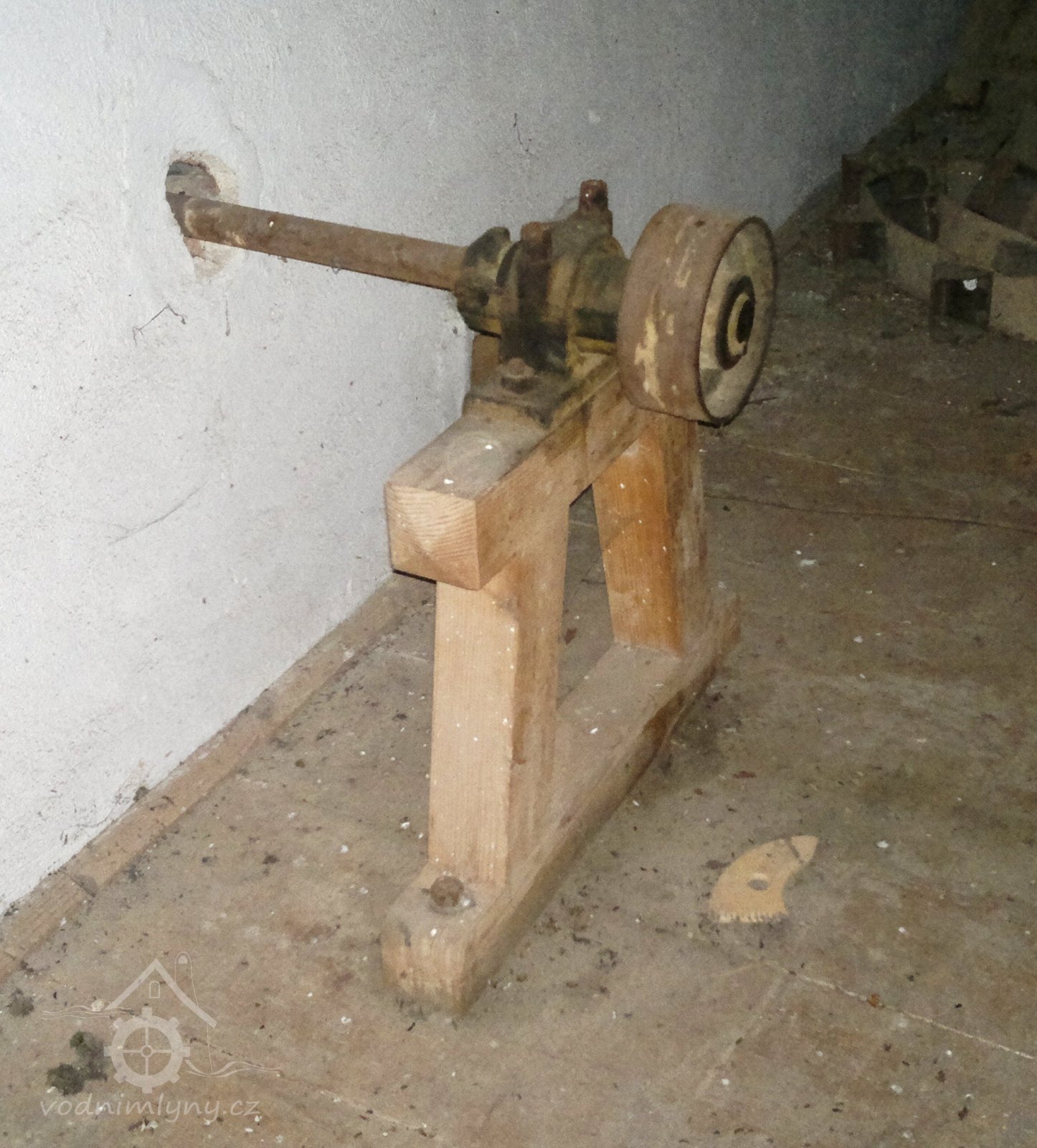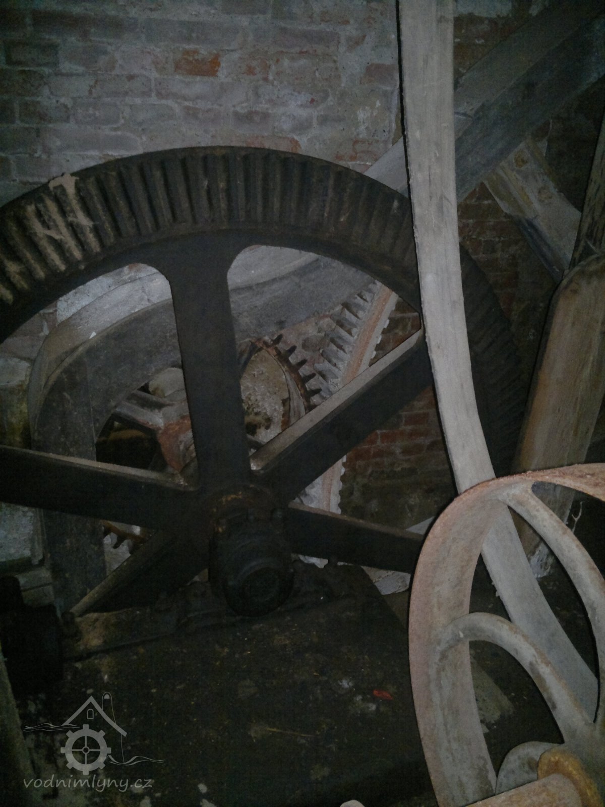 pohon kamenného mlecího složení od transmise, 2013, © David Veverka, (Prvky na obrázku: transmise, řemenice, převody)