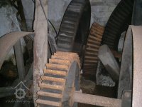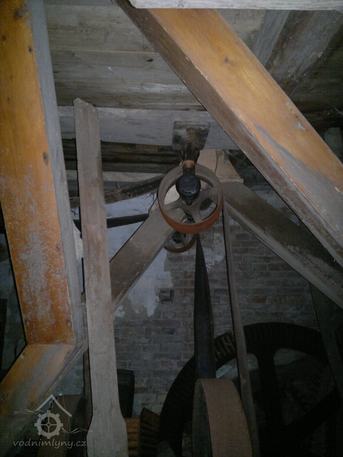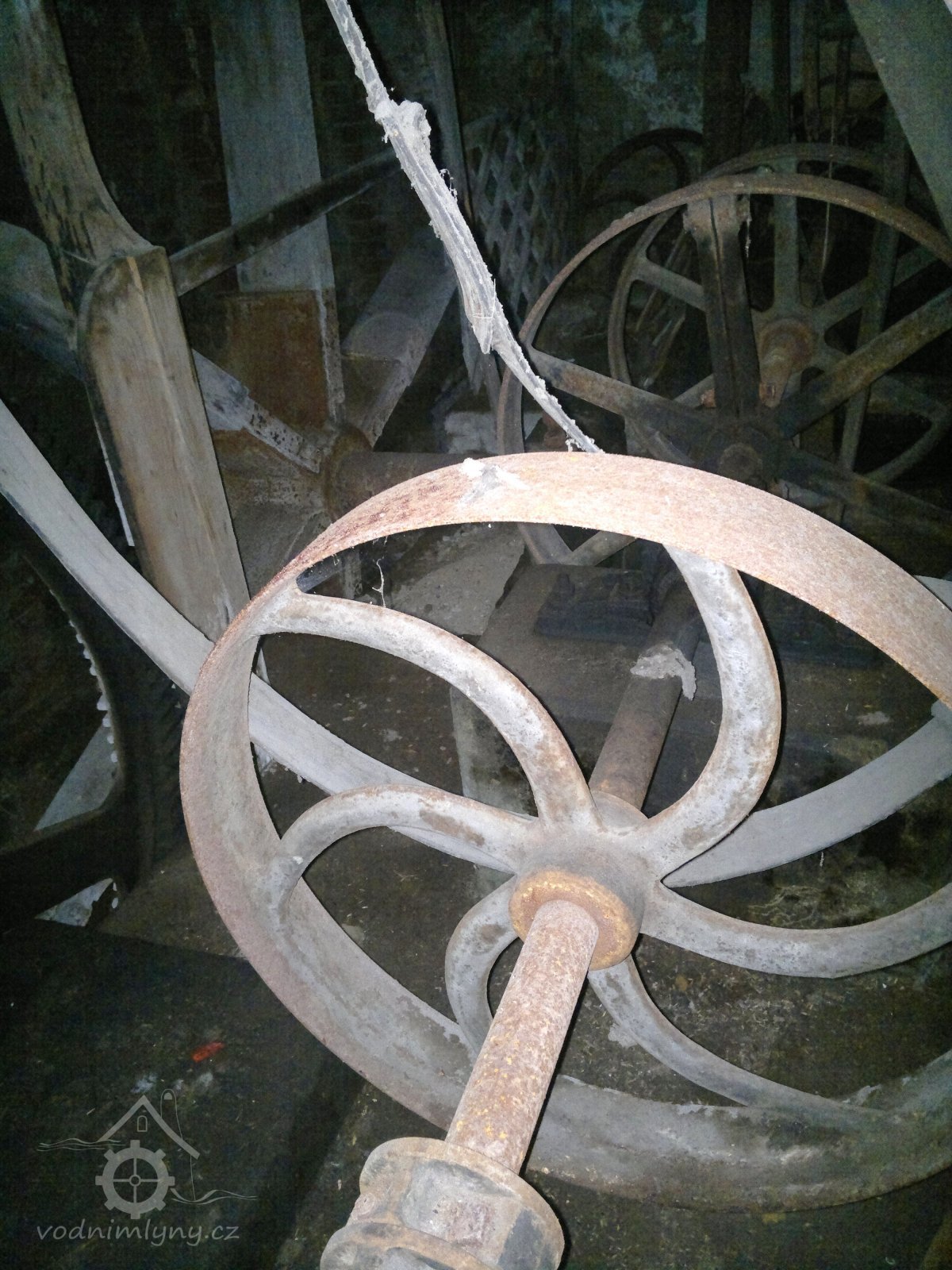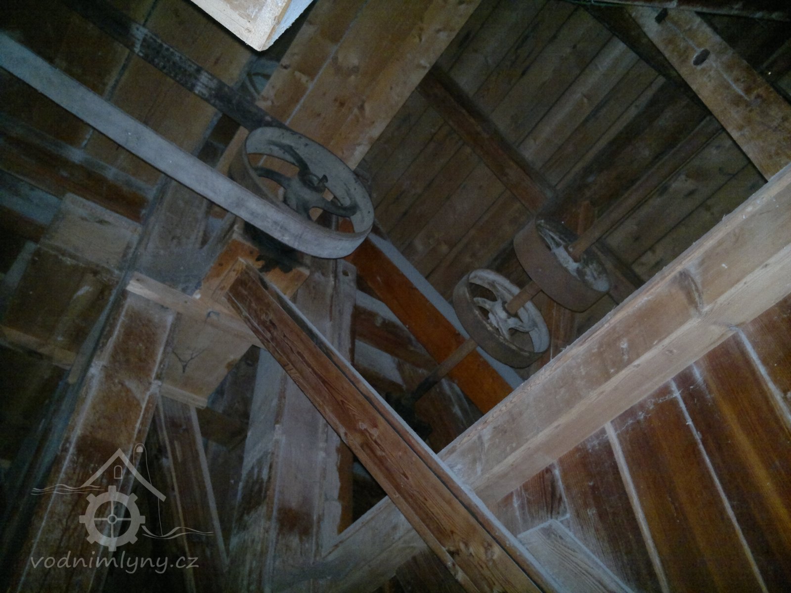 rolny polozkříženého řemenového převodu k pohonu mlecích kamenů, 2013, © David Veverka, (Prvky na obrázku: transmise, řemenice, převody)