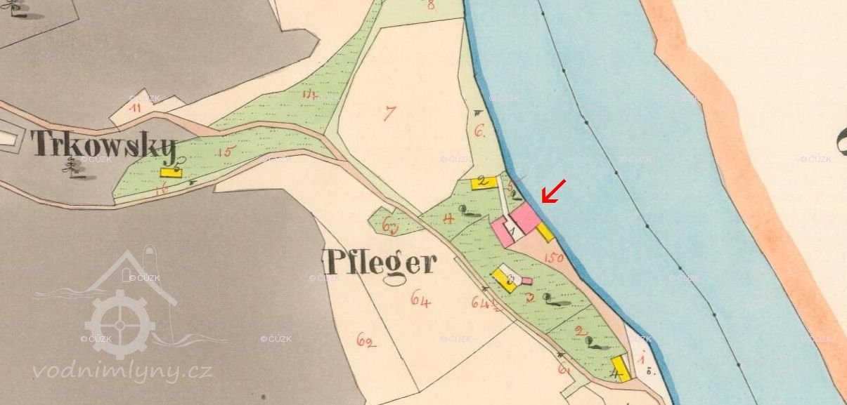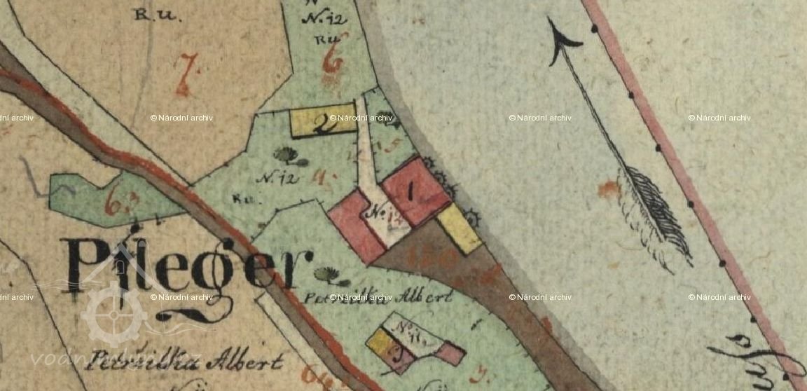 V roce 1830 vlastnil mlýn Pfléger Franz. Dříve čp 12. (RŠ)