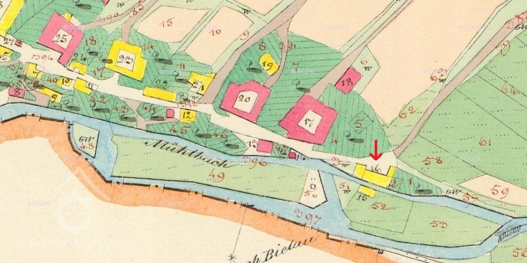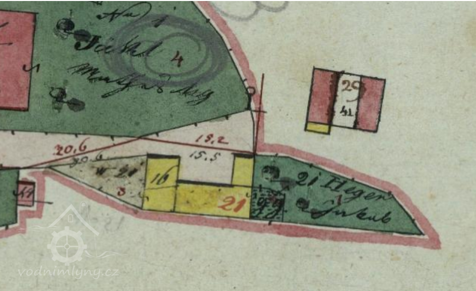 Mlýn je zachycen na mapě 1. vojenského mapování. Mlýn měl čp. 21. V roce 1835 mlýn vlastnil Jakub Heger.