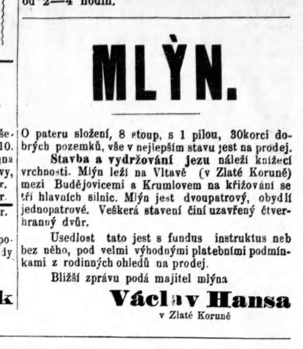 1883 - jez mlýna pod správou vrchnosti, majitel Václav Hansa (viz. inzerát v kartě Ikonografie, edit PK)