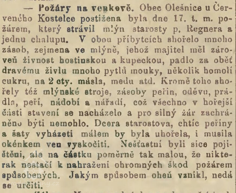 Z toho se dovídáme, že v r. 1734 měla rybník pronajatý obec Olešnice. Olešnický rychtář Josef Šafránek byl vzdělaný a schopný dobře vést svěřený panský mlýn.