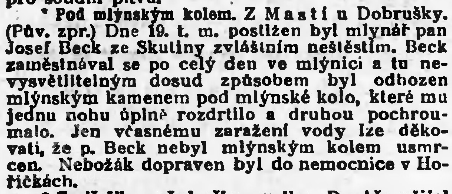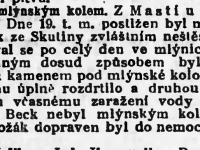 19. 3. 1908 těžký úraz mlynáře Josefa Becka (RR).