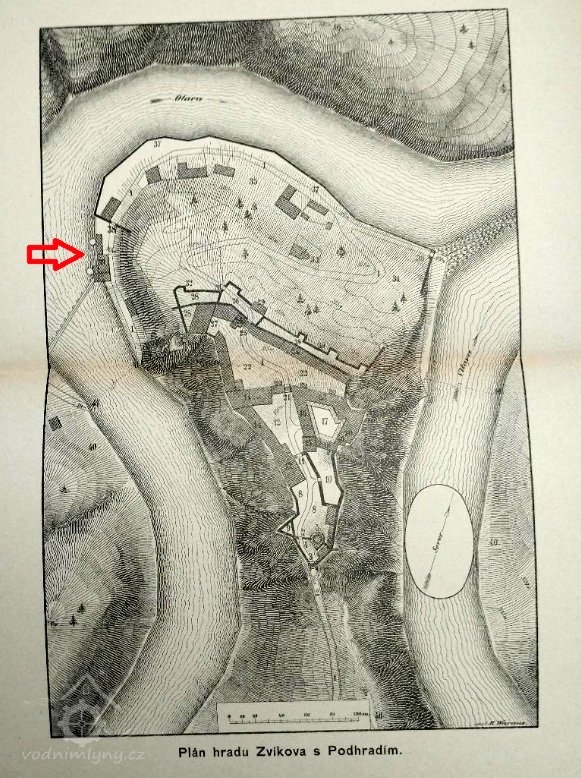 Mlýn stál pod jezem na pravém břehu Otavy, hned za Otavskou bránou, která umožňovala vstup do podhradního mestečka od přívozu z levého břehu Otavy. Připomíná se v r. 1432 jako nově vystavěný. Často byl poškozován povodněmi, zaznamenána je oprava v r. 1440. v r. 1512 byla ve mlýně instalována nová kamna. Celý nový mlýn se opět stavěl v letech 1546-1547 mlynářem Jírou z Tábora a zedníkem Janem z Písku. Z této stavby se patrně dochovala část zdiva se sgrafitem až do 20. století. V roce 1574 měl mlýn tři kola na spodní vodu a jeden stupník a jeho hodnota se odhadovala na 500 kop grošů českých. Posledním zvíkovským mlynářem byl Arnošt Pulz, který zemřel na Štědrý den r. 1918 a je pohřben na oslovském hřbitově. Za necelé dva roky po jeho smrti byl mlýn zbořen.
