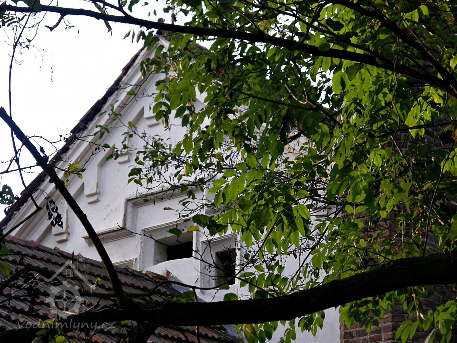 Pohledem voyera na štít jižní strany mlýna, 2014, © Kolssteyn, (Prvky na obrázku: plastická omítková výzdoba fasád a štítů)