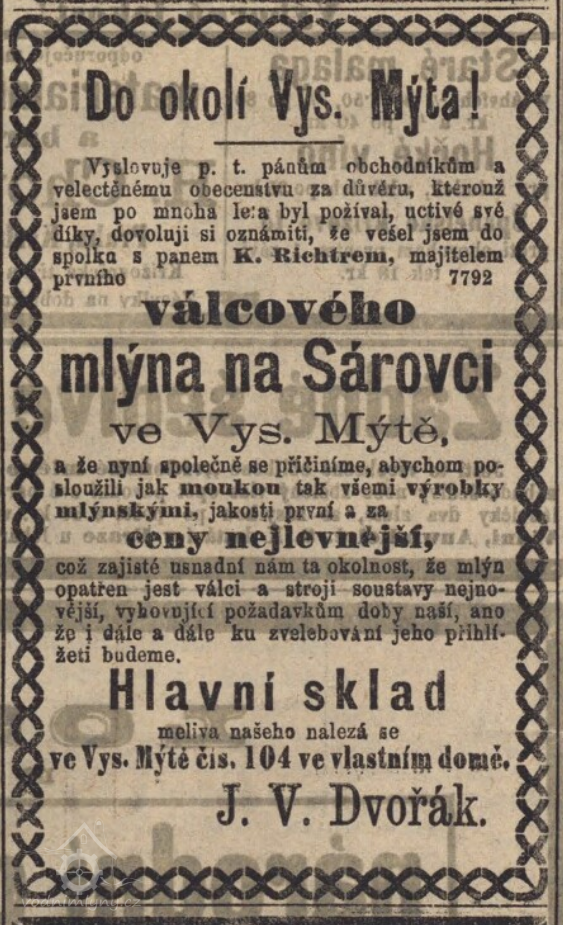 Víte, že...V roce 1863 se majitelem vysokomýtského mlýna Sárovce čp. 184 stal Karlouš Richter!? Tento mimořádný a vzdělaný člověk - studoval v Olomouci, Praze a ve Vídni - zanechal v historii Vysokého Mýta nesmazatelné stopy. Od roku 1867 je členem městské rady a na jeho podnět se zakládá městský archiv a také naše muzeum - nejstarší městské muzeum v Čechách. Podal i několik podnětů, které se nerealizovaly. Za všechny zmiňme v té době unikátní návrh stavby krematoria ve Vysokém Mýtě již v roce 1884!
