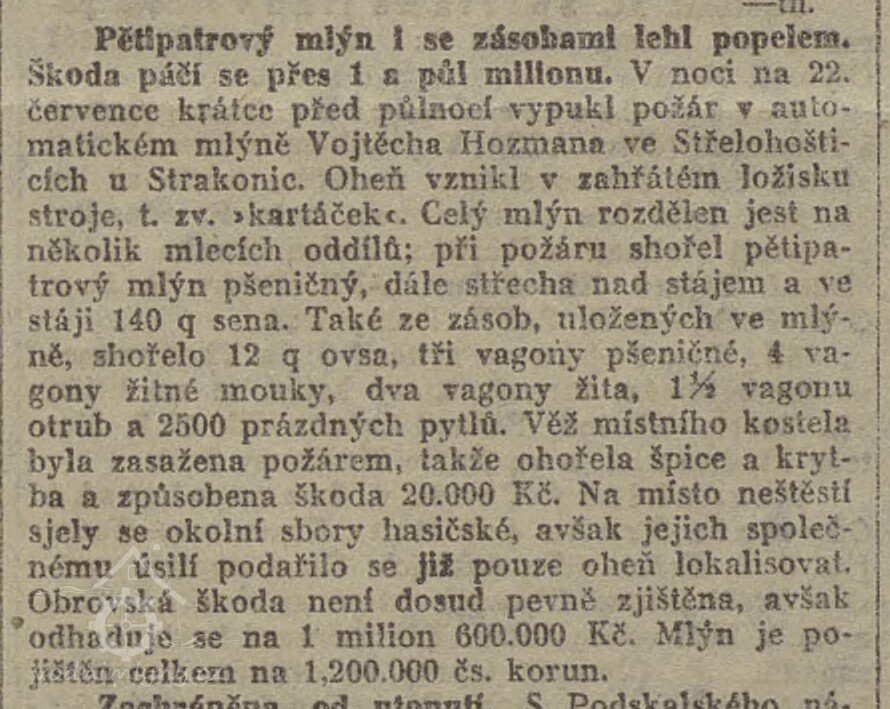 1887 mlýn vyhořel na pravé straně u mlýnské stoky, zvané žitná strana