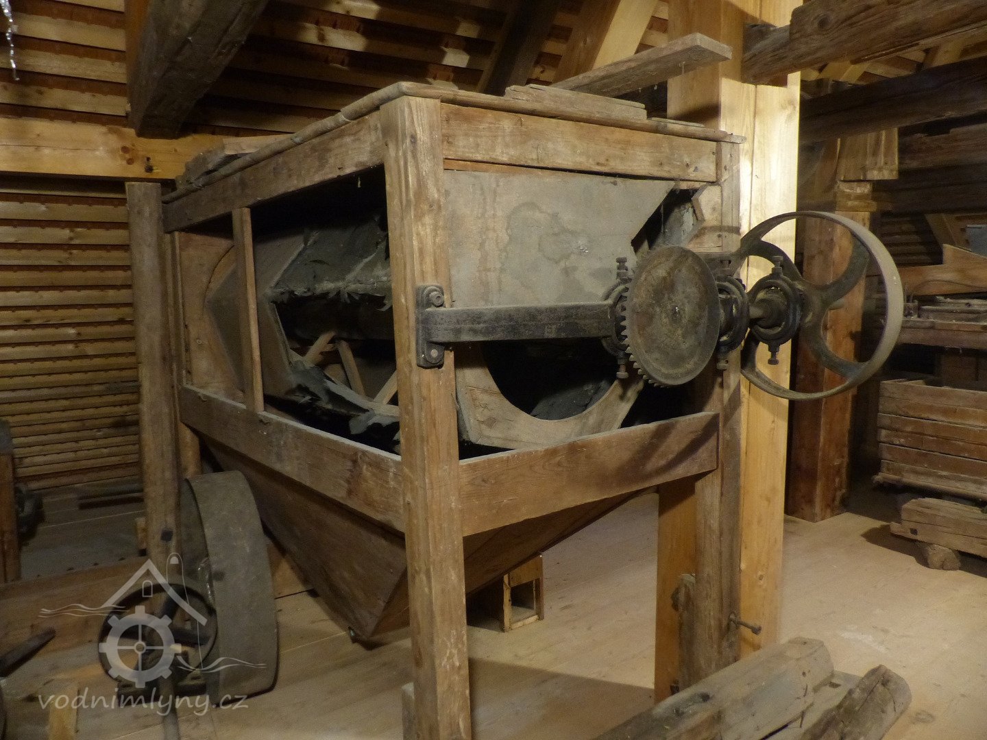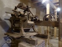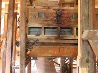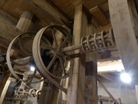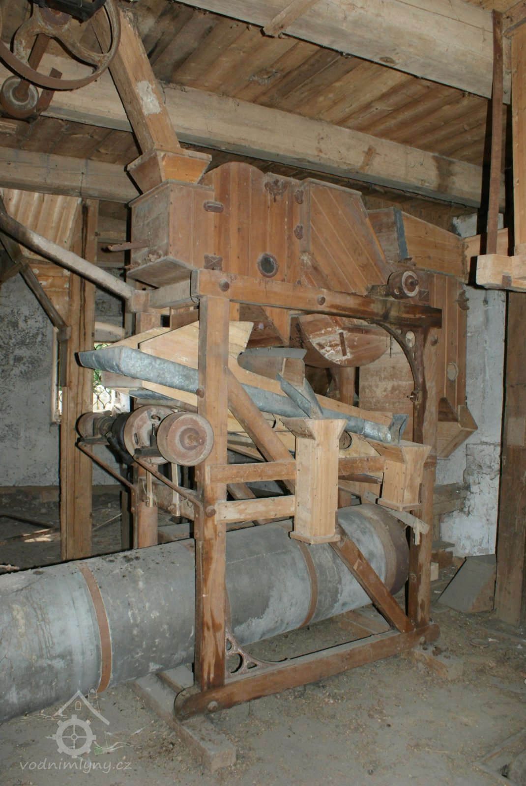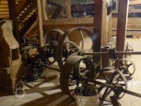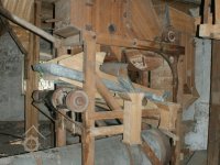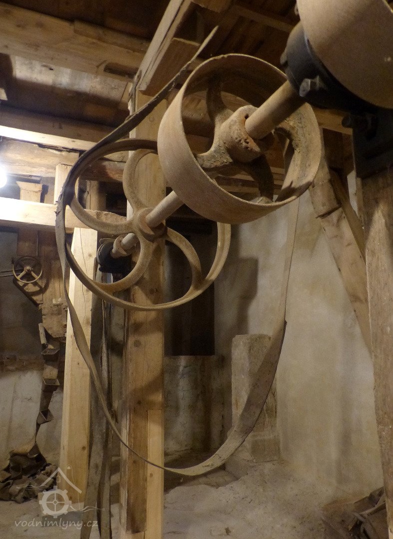 Interiér mlýnice, 2011, © Jan Pešta, (Prvky na obrázku: transmise, řemenice, převody - transmisní hřídele s řemenicemi (výrobek průmyslový i řemeslný), mlýnská hranice, válcová stolice)