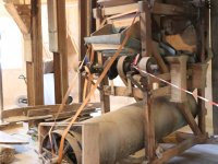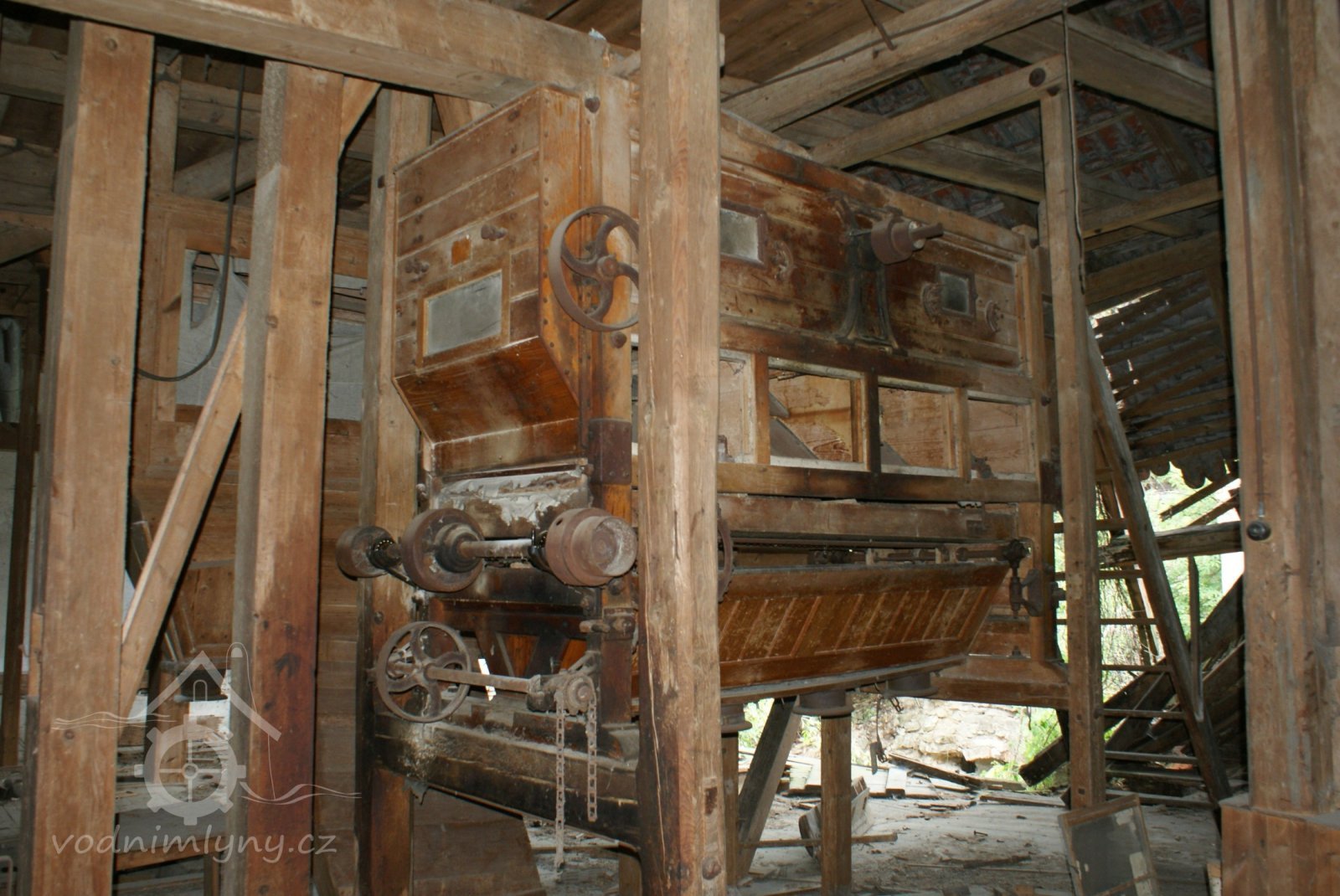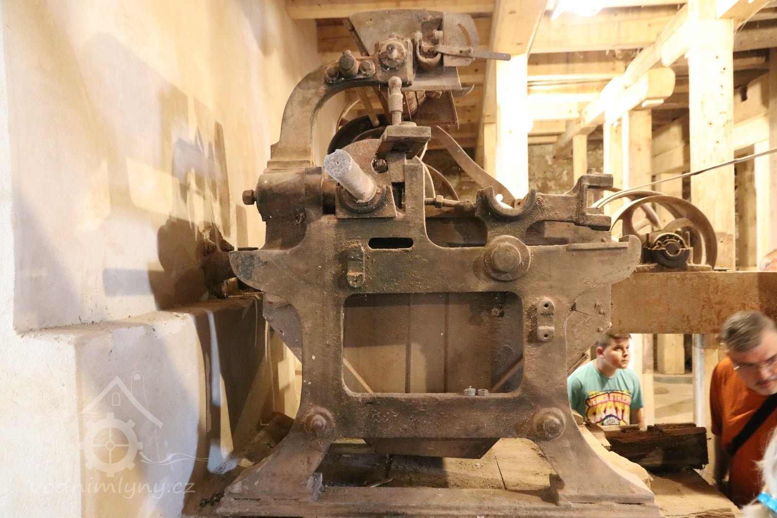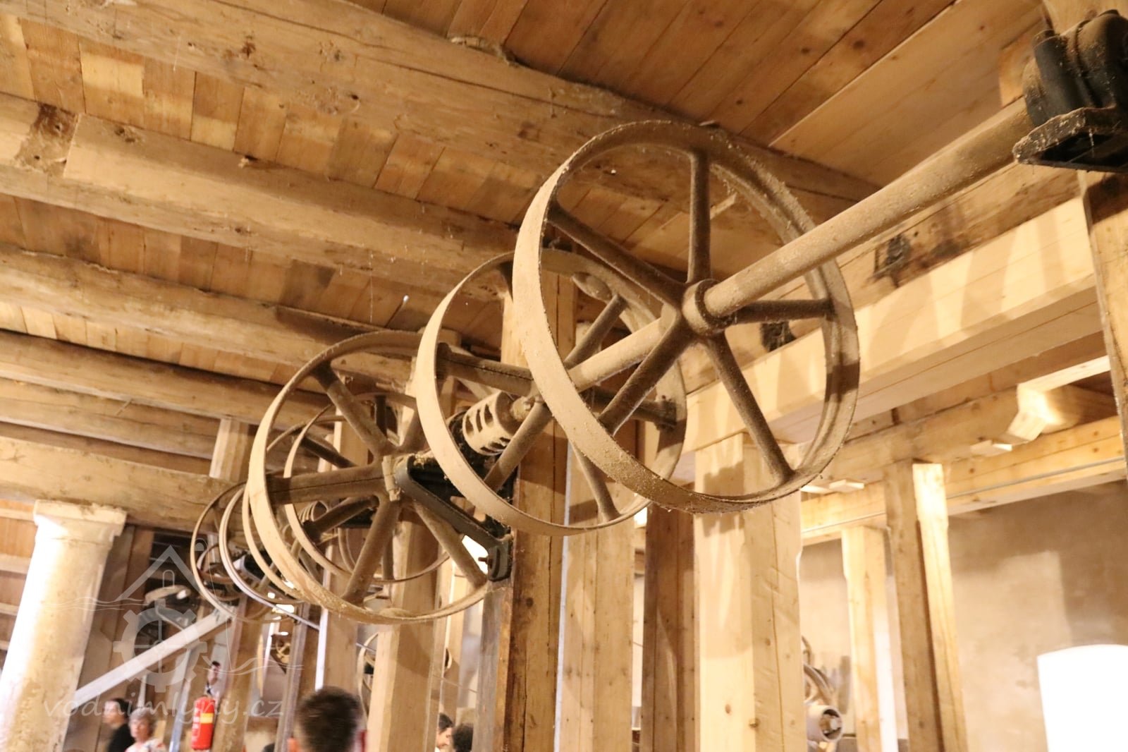 Interiér mlýnice, 2011, © Jan Pešta, (Prvky na obrázku: transmise, řemenice, převody - transmisní hřídele s řemenicemi (výrobek průmyslový i řemeslný), mlýnská hranice, válcová stolice)