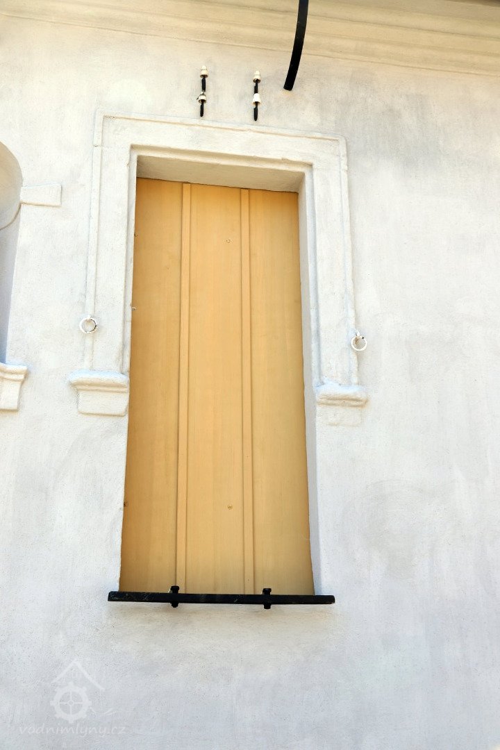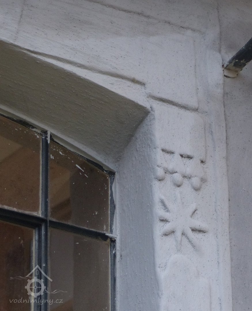 Pohled na mlýn, 05 2025, © Tomáš Jílek, (Prvky na obrázku: epigrafické památky (nápisy, datování aj.), plastická omítková výzdoba fasád a štítů, zdobený zděný štít)