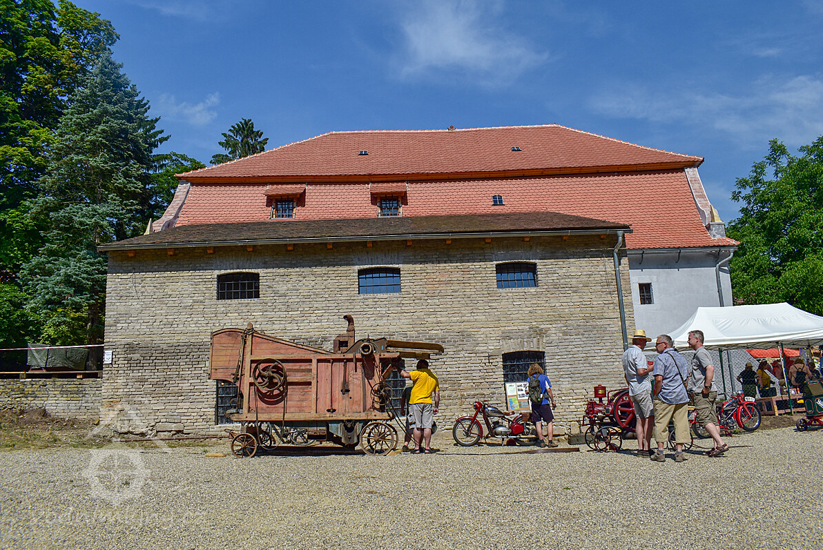 Transmise k mlátičce, 05 2025, © Tomáš Jílek, (Prvky na obrázku: transmise, řemenice, převody - transmisní hřídele s řemenicemi (výrobek průmyslový i řemeslný), pohon zemědělských strojů)