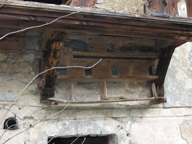 budova sýpky - V průčelí, detail holubníku pod pavlačí, 03 2009, © Hana Marie Hermanová, (Prvky na obrázku: pavlač, balkón)
