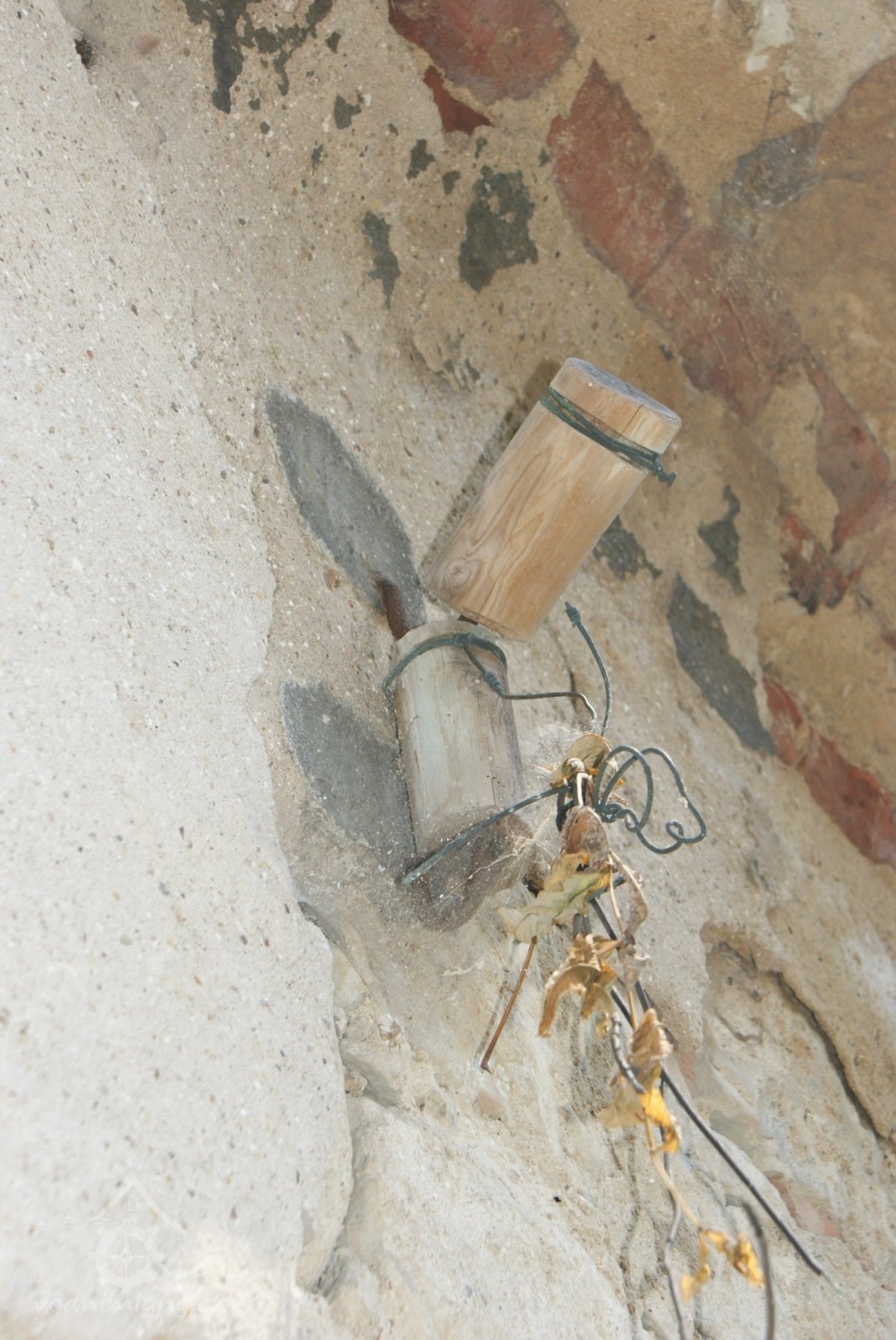 Ojediněle dochovaný dřevěný izolátor domácí výroby, 2011, © Urbánek, (Prvky na obrázku: výroba elektrické energie)