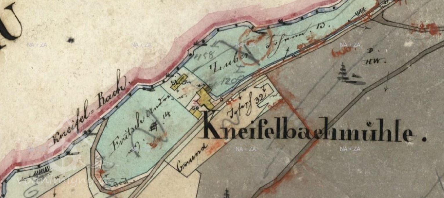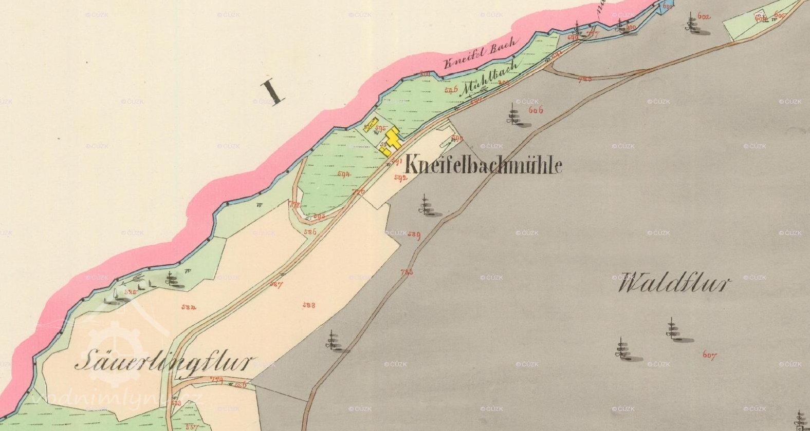 Datum vzniku mlýna není známo. Mlýn není uveden v žádném historickém dokumentu. Na mapě Josefského mapování z r. 1764 není zakreslen. Mýn je uveden na mapě II. vojenského mapování z r. 1836. Na mladších mapách je mlýn zakreslen. Podleský potok se nazýval Kneipelbach.