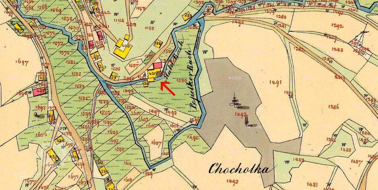 To dříve to bylo jiné. Louka patřívala k mlýnu, který stával v místě, kde později byla zřízena pila. Za mlynářem Jandou přišel r. 1856 neznámý muž a prosil ho, aby mu dovolil kopat na jeho louce, že je tam určitě zakopán poklad. Ten muž se jmenoval Josef Lacina a byl ze Starého Bydžova. Mlynáři vypravoval, že viděl tu čarodějnickou knihu a přesně ví, kde poklad hledat. Tak se nakonec dohodli – přes den bude Lacina vypomáhat ve mlýně, za což dostane jídlo, nocleh a mlynář mu zapůjčí nářadí, a jinak si může na louce kopat. Tak tomu také bylo. Ale kdo si myslel, že po několika dnech či týdnech marná lopota Bydžováka odradí, byl na omylu. Neúnavně, den co den, ráno před prací na poli a po ní, i dlouho do noci, kopal a kopal. Vždy vyhloubil díru asi 1x1 metr širokou, pak ji zaházel a začal kopat vedle. Celkem takhle kopal dvacet let, jen jednou za rok se vypravil za sestrou do Bydžova, ale nikdy se tam nezdržel. Lomničtí si na jeho kopání zvykli a za pár let brali zvonění krumpáče o kameny pod Chocholkou jako samozřejmost. Lacina se s nikým moc nebavil, nikomu nepřekážel, byl tichý a skromný, žil jen s vidinou budoucího bohatství. Musel jím být snad posedlý, že to vydržel tak dlouho. Jednou se z návštěvy v Bydžově již nevrátil a nikdo neví, co se s ním stalo. Snad dostal rozum a dvacet let marné práce mu již stačilo. Lomničtí na něho ještě dlouho vzpomínali a pověsti o pokladu pod Chocholkou věřil poté jen málokdo, vždyť louka byla celá několikrát překopána.