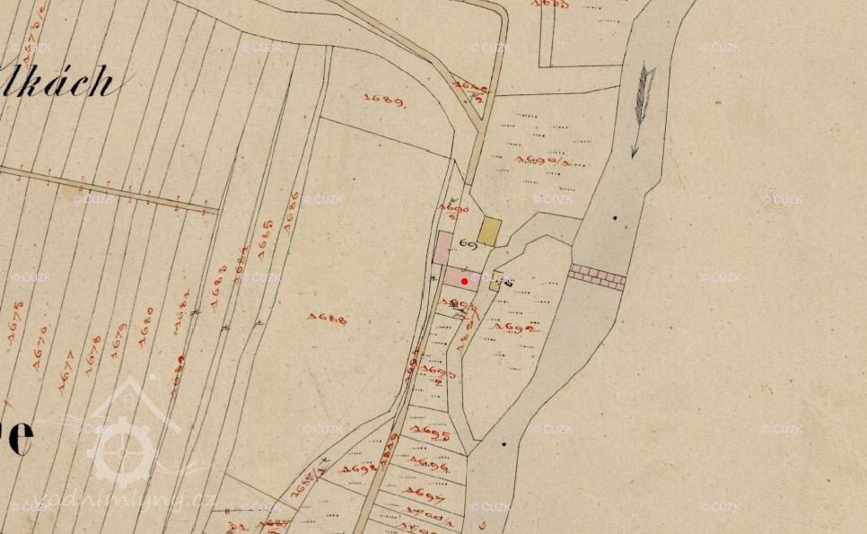 Z vodní knihy [56] máme zachovaný nákres situace pro určení hamu [57] pravděpodobně z roku 1886, na níž je zachycen krupník [58] a kašník [59] a k nim vedoucí dva žlaby na vodu. Z toho lze jasně usuzovat, že mlýn měl v této době dvě vodní kola na spodní vodu pohánějící krupník a kašník. Také je zde popsán ham a jeho přesná poloha, konstrukce jezu a vodního díla, vodní podmínky i technické údaje. V roce 1889 kupují mlýn manželé Josef a Rosalie Šebelovi, [60] za kterých mlýn dvakrát vyhořel. Po nich hospodaří po drobných opravách na mlýně Pařízkovi a nájemci Rubeš a Melkus. [61] V roce 1902 [62] potom kupují mlýn manželé František Havliš a Marie Havlišová rozená Krupičková. Po nich zdědila mlýn jejich dcera Justina provdaná za Bohumila Laštovičku. Ti pak prodali celou usedlost v roce 1925 [63] Marii a Antonínu Dvořákovým.