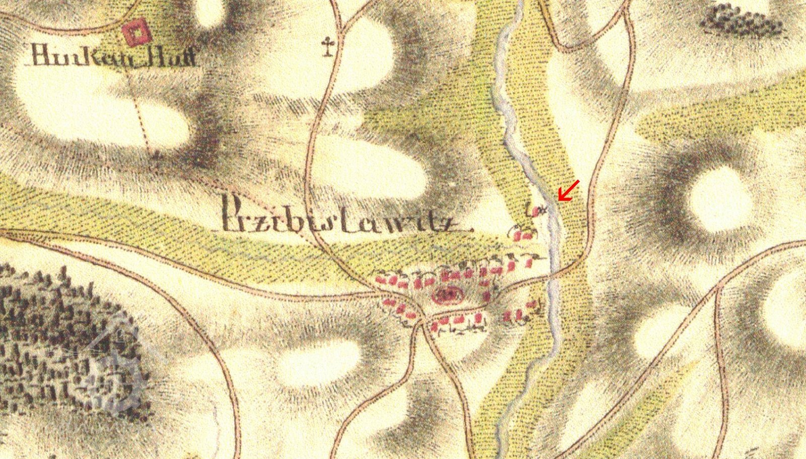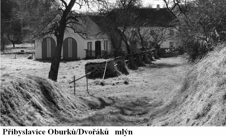 51 Soukromý archiv rodiny Dvořákových. „Roku 1793 Léta Páně dne 31. července popouští dobrovolně svůj mlýn Antonín Vobůrka svému synu Ignácovi za 1.000 zl. Rýnských a to s následující výminkou: Antonín Obůrka vymínil sobě pod 12 měr polí, totiž od Hrotůvky od vrchu pod 4 míry, Nad strání od předního konce pod 4 míry, Na hlíně pod 2 míry a na Přítržích pod 2 míry, kteréžto pole jest hospodářbeze všeho platu obdělávati, jakož i mrvu darmo voziti, též louku na ostrově sobě vymiňuje. Naproti tomu bude ale výminkář nápomocen kotribucí měsíčně po 12 kr. vypláceti. Výminkář ještě sobě vymiňuje každoročně 1 kopu kladu bez platu zřezati, naproti tomu ale uvoluje se pilu v dobrém stavu držeti a když bude potřeba novou stavěti s polovičním nákladem. U vystavení té pily hospodářovi nápomocen bude. Item 2 krávy a 2 telata s hospodářovým dobytkem pásti bude a sobě vymiňuje, jakož také pro dům, nikoliv ale na handl povinen bude hospodář výměnkářovi darmo tj. bez mejta mleti. Tuto vejš řečenou vejměnku Antonín Vobůrka netoliko pro sebe, nýbrž po smrti jeho, když by jeho manželka déle živa byla než on, do její smrti, po její pak smrti kterémukoliv synovi pak on, Anton Vobůrka odporučiti chtíti bude, též do smrti jeho syna zcela a zouplna k užívání jemu odevzdána jest. Zanechává Anton Vobůrka k svému mlejnu 1 vůz kovaný, 1 pár volů, 2 krávy, rádlo, 2 brány jakož i také zasetí jarního a zimního 2 díly hospodářovi 1 díl pro sebe ponechává. Hospodář bude povinen, když by z to o býti mohl v osmi po sobě běžících létech 800 zlatých svým bratrům a sestře vyplatiti a to předně Martinovi pak Francovi, Mariáně a poslednímu Antonínovi – každému po 200 zl. Kdyby ale odnikud pomoci neměl tedy po 25 zl každého roku vejš jmenovaným bratrům a sestře nevyhnutelně vyplatiti má. A sice první 2 léta Martinovi, pak sice každá 2 léta Francovi, pak Mariáně, posledně Antonínovi a pak zase začne prvním a pak na ten způsob zase vždy opakovati bude až všechno vyplatí, Anton Vobůrka z Přibyslavic.“