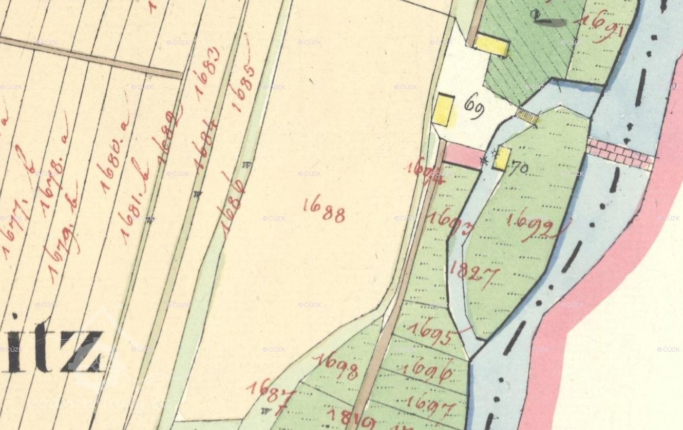a 520 sáhů s výnosem 6 centýřů 24 liber sena v ceně 3 zl. 7 ½ kr., celkem 32 jiter 1567 sáhů pozemků s hrubým výnosem 103 zl. 55 ½ kr., daně platil 12 zl. 11 ½ kr.“
