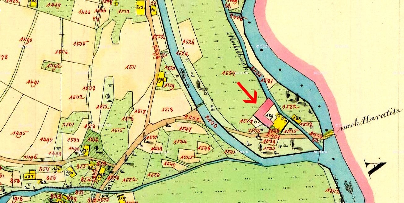 Nebo v tom mlýně bývali mlynáři nepoddaní, ale do obecní hromady do Držkova k rychtáři chodívali, ourok ze mlýna platívali a některý na konev, některý na dvě konve piva pánu Držkovskému dávali. Že pak nynější mlynář Václav Jůna před 9 lety nemohl se srovnati s Janem Rezlerem z Plavu obecním rychty Držkkovské, vyžádal sobě od mil. vrchnosti, aby připsán byl rychtě Haratické. Proč ale on z pekaření platí i do Držkovské i do Haratické rychty, příčina jest: že hlavní .... jako jiní handlířové neměli a z obojí strany k němu lidé chodějí kupovati. Ostatně i role mlynářova jest na plavské straně.