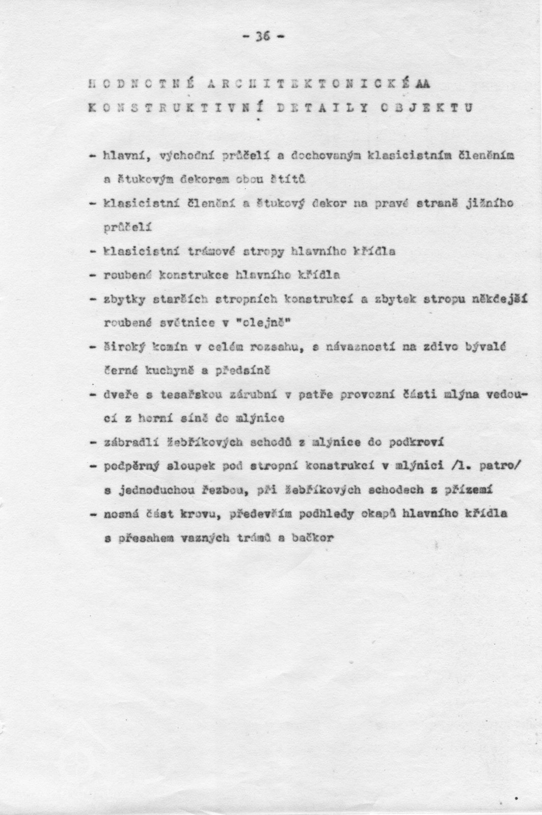 Velmi zajímavý mlýn z hlediska historického a architektonického vývoje, stále disponující mimořádným architektonickým výrazem a s dochovaným strojním zařízením. Zcela unikátní je zde mechanická olejna, pozornost si zaslouží pohon pily, stabilní motor a hranolový vysévač s moučnými truhlami.