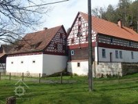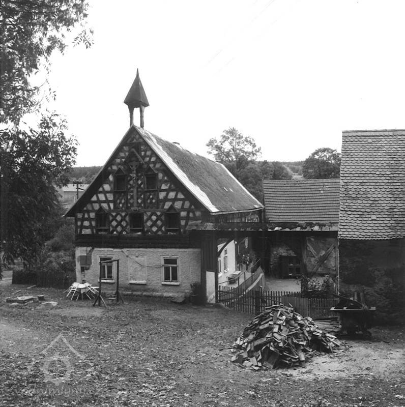 Bývalý mlýn s hospodářstvím, skládající se z obytného stavení, kůlny, chlévů a stodoly. Patrové obytné stavení má zděné přízemi o 3 okenních osách v průčelí; hrázděné patro na roubeném věnci má bohatě členěnou konstrukci a je kryto sedlovou taškovou střechou. Oba štíty domu jsou bohatě členěny; průčelní, do stráně obrácený štít má v ose mezi okny zavěšen krucifix se sochou Bol. P. Marie a ukončuje ho zvonička s nízkou plechovou stanovou stříškou. Okna v patře domu mají původní dřevěné rámy s trojúhelníkovými římsami v nadpraží. K domu připojena dřevěná původní vrata. V pravém úhlu k obytnému stavení směrem k potoku je situována budova zděných chlévů s bohatými hrázděnými štíty, spočívajícími na roubeném věnci; střechu sedlovou kryjí tašky. Hrázděná, do dvora otevřená kůlna je podepřena dřevěnými trámy a krytá sedlovou střechou. Mlýnské zařízení zničeno.