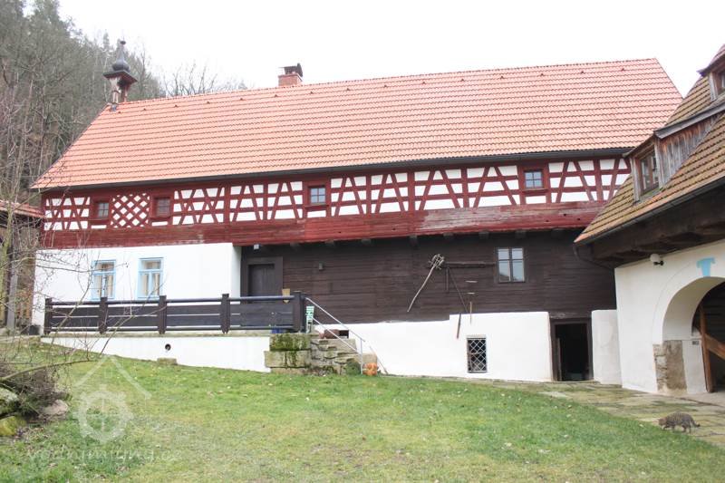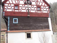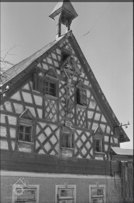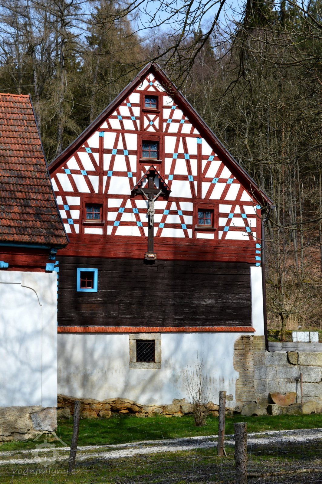 Obytné stavení je patrové, s převážně zděným, resp. novodobě přezděným přízemím, dřevěným patrem a hrázděnými štíty. Původní roubení v přízemí je dochováno na části dvorní stěny, patro tu předstupuje na profilovaných koncích vysunutých stropních trámů. V předním štítu otočeném na SV od svahu, k lesu jsou v hrázděné diagonále skládaná pole, pod okny podkroví je hustší síťování. Ve štítech se projevuje skladba krovu - nad obytnou částí ležaté stolice, nad mlýnicí stojaté stolice. Ojedinělou skladbu má hrázdění na dvorní straně nad světnicí, mezi okny je tu delší diagonálně skládané pole. Okna ve štítu mají profilované římsy a frontony. Ve štítě k silnici je osazen dřevěný Kristus, který byl původně ve štítě směrem k lesu. Na sedlové střeše je zvonička.