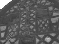 Nad přízemím objektu je nad roubeným věncem vyneseno hrázděné polopatro, na dvorní straně částečně rozšířené. Trojosé severní a jižní průčelí jsou završena bohatě členěnými zdobenými hrázděnými štíty se složitým šachováním s barevně kontrastními dřevěnými konstrukcemi a styčnými body trámů a bíle omítanými výplněmi. Ve štítech jsou situována menší čtvercová okénka s dřevěnými trojúhelníkovými štíty, doplněná původně dřevěnými okenicemi. Na severním štítu býval původně osazen velký dřevěný kříž s lidovou plastikou Ukřižovaného Ježíše Krista a stříškou. Dnes je menší krucifix osazen na jižním štítu.