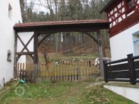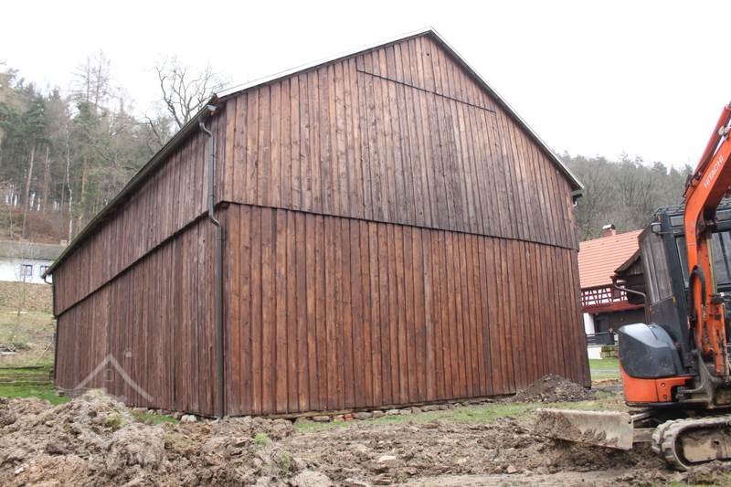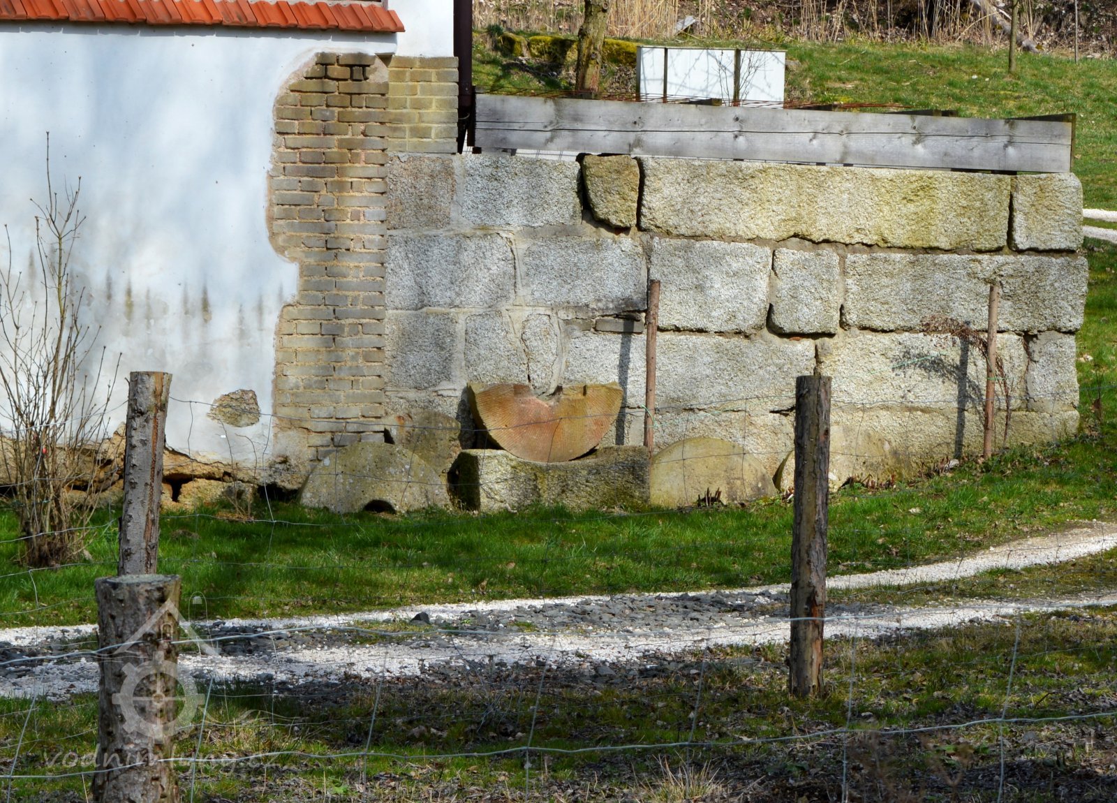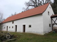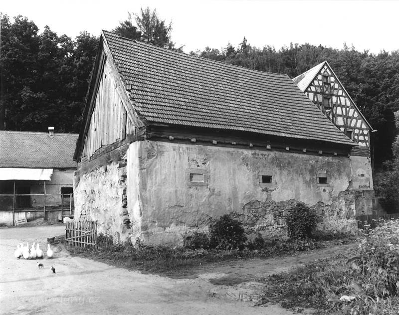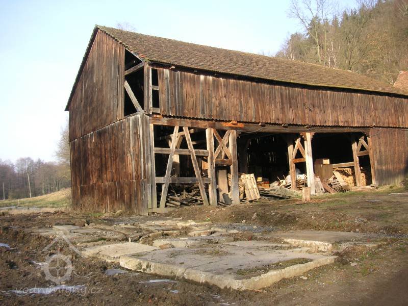 Z lomového kamene vyzděná budova chlévů s datací 1848.
