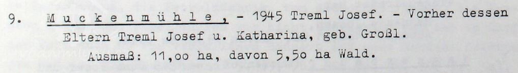 Jednalo se o samotu v katastrálním území Hamry/dnes Hamry na Šumavě/.Mlýn, přesněji obytné a mlýnské stavení čp.9 se stájí a stodolou stálo na stavební parcele č.85.Nemovitost je zobrazena na mapě Stabilního katastru :Čechy:1768-1, mapový list č.005.Již v době vzniku mapy Stab.katastru mlýn patřil rodině Treml.K vlastnictví: stav do r.1945: