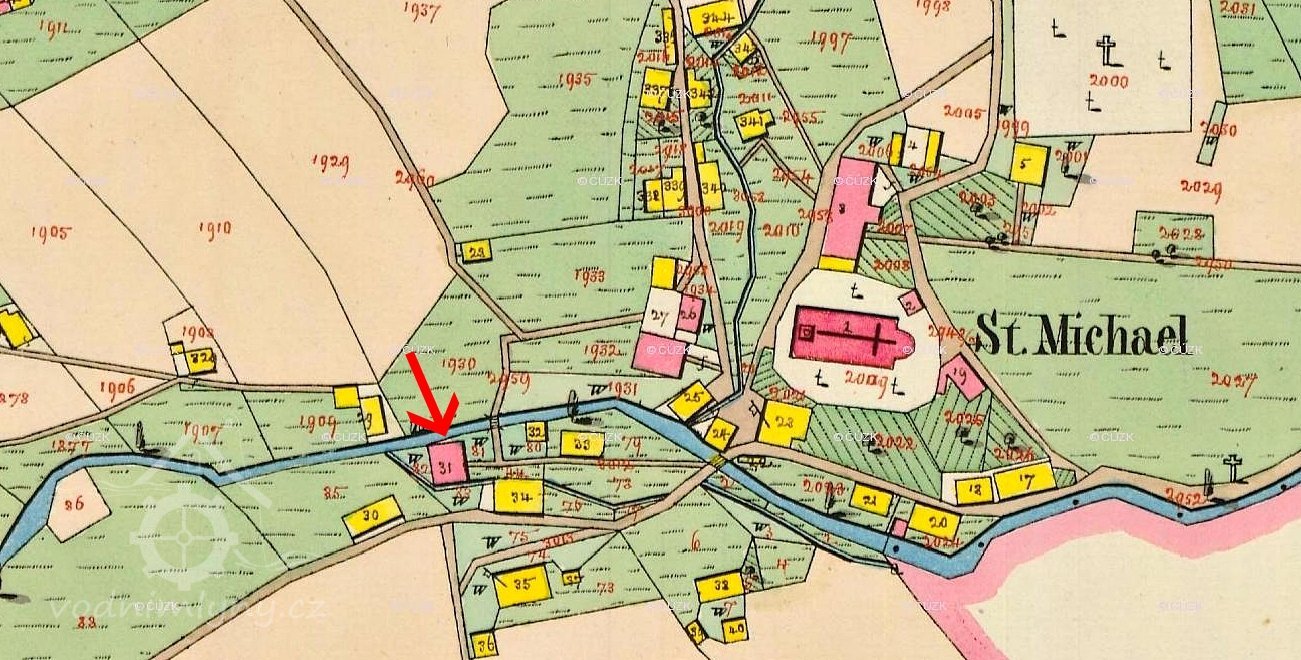 Mlýn se nachází asi 150 m východně od kostela sv. Michala.