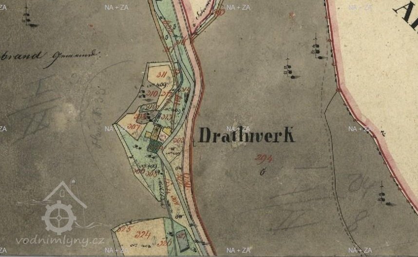 Na mapě Chebského kraje z roku 1715 je mlýn ještě označen jako obilný mlýn. Na mapě z roku 1742 Thermas Carolinas je již mlýn označen jako drátovna s odlišným symbolem mlýnského kola. V kronice města se zhruba do roku 1720 hovoří o mlýnech. Po tomto datu již kronika výslovně hovoří o mlýnech, papírnách, drátovnách. Jinak tento mlýn společně s dalšími v oblasti zvané Mühlengrünn (později Mühlenthal) patřil společně s Horním Žďárem městu Jáchymov.