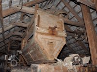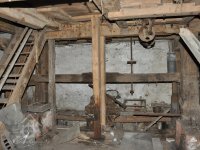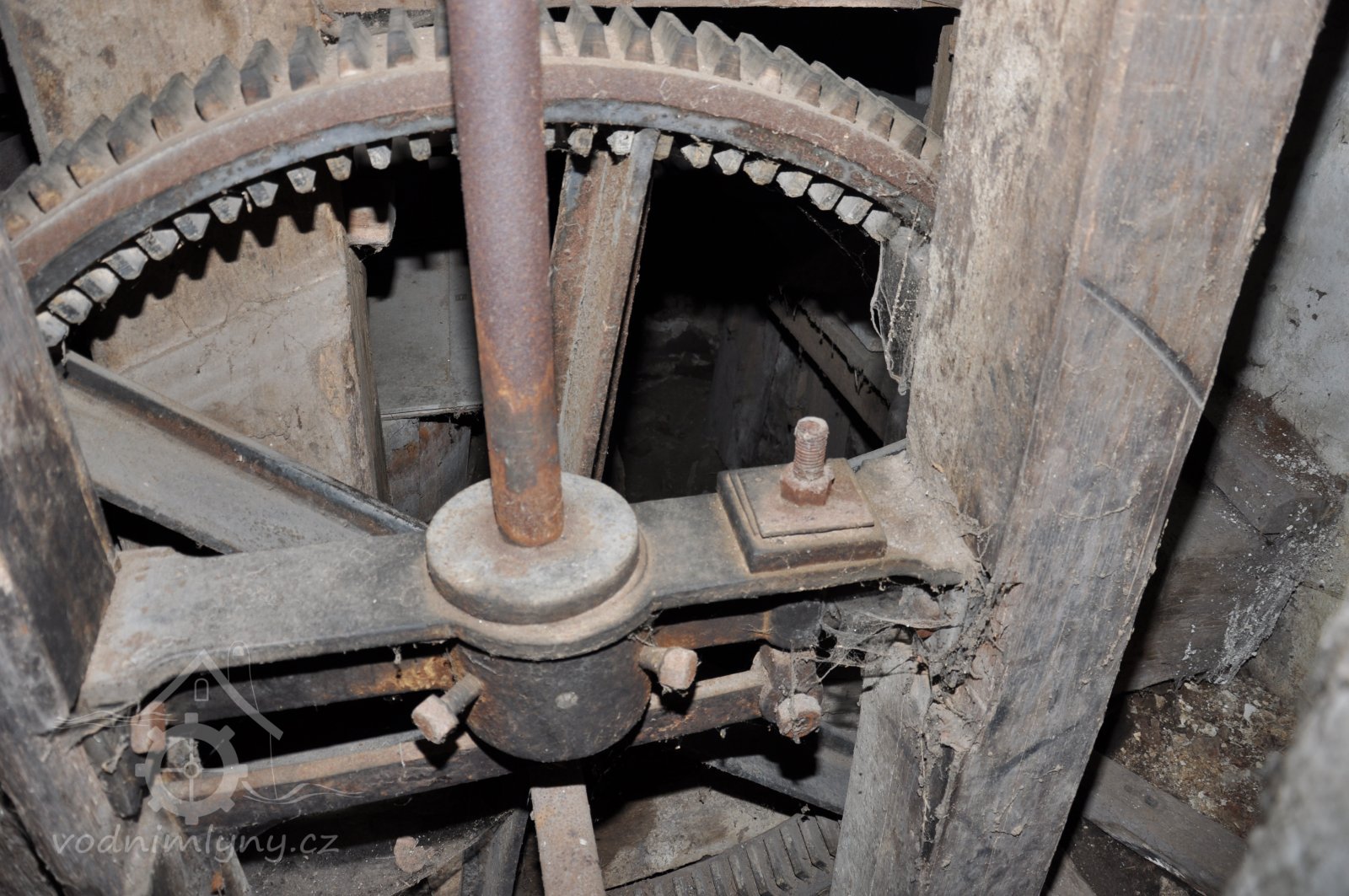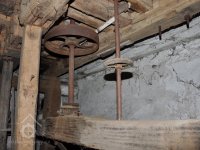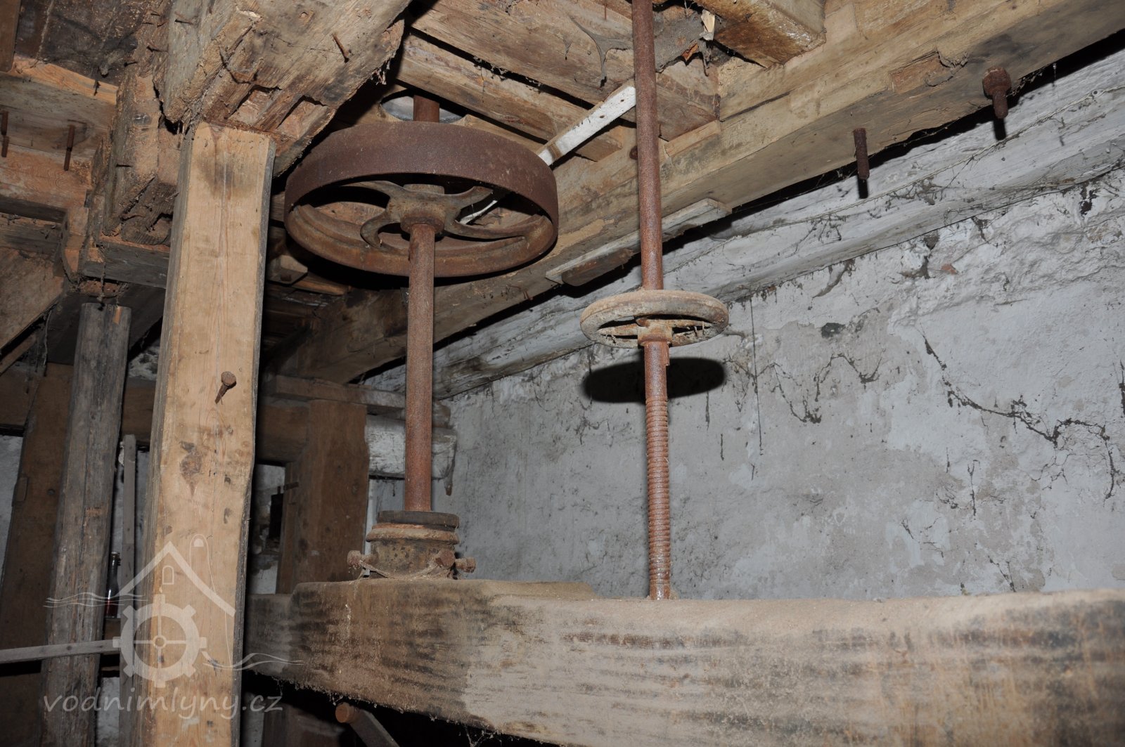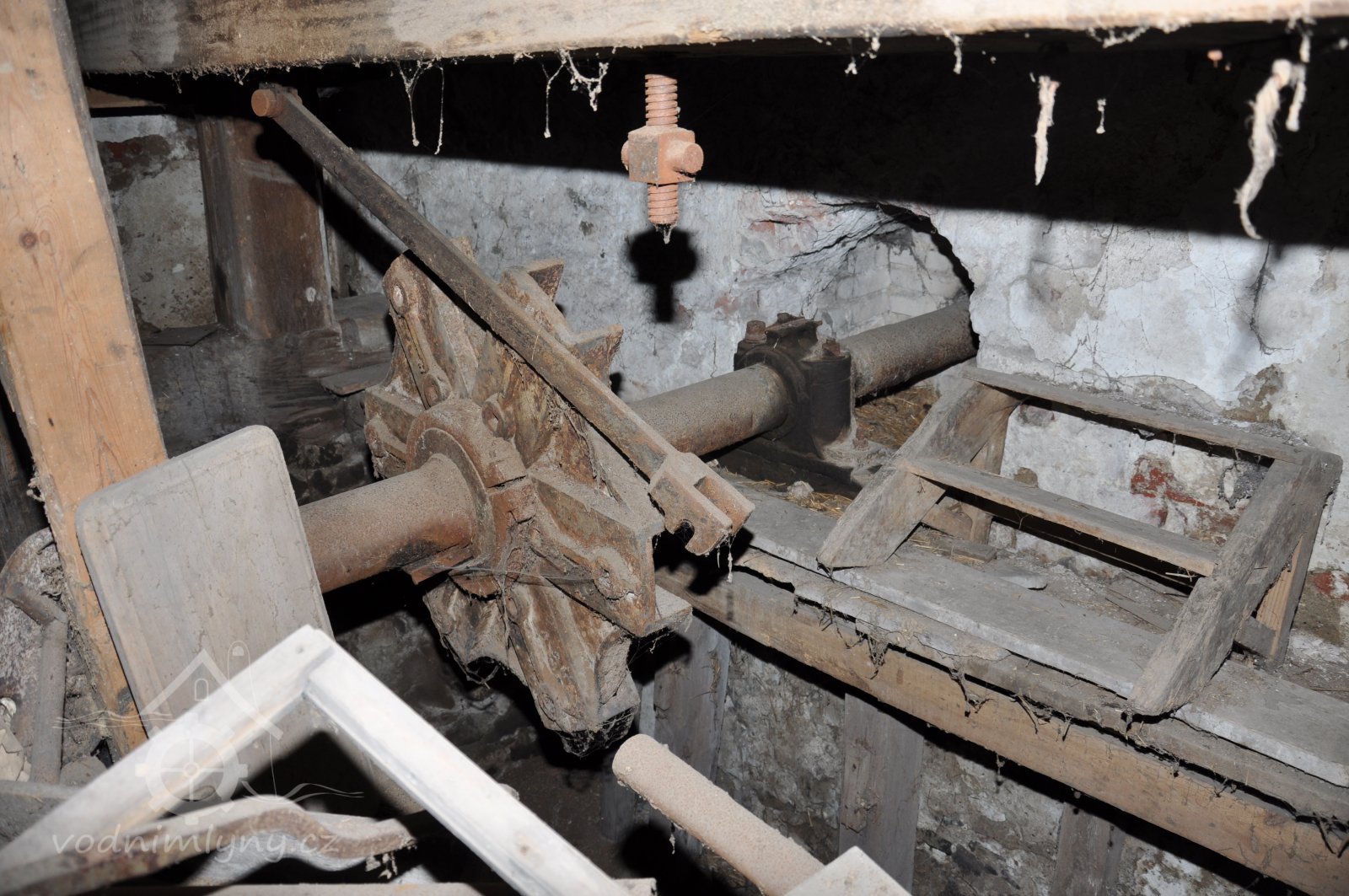 detail zajímavé regulace (lehčení) 2. kamenného složení a paleční převod předlohový bez dochované transmise, 2015, © David Veverka, (Prvky na obrázku: transmise, řemenice, převody, regulátor)