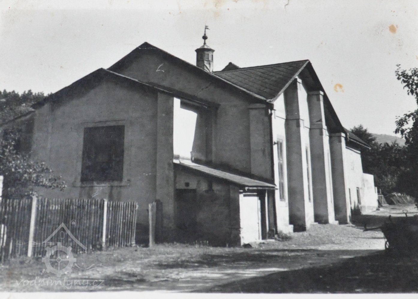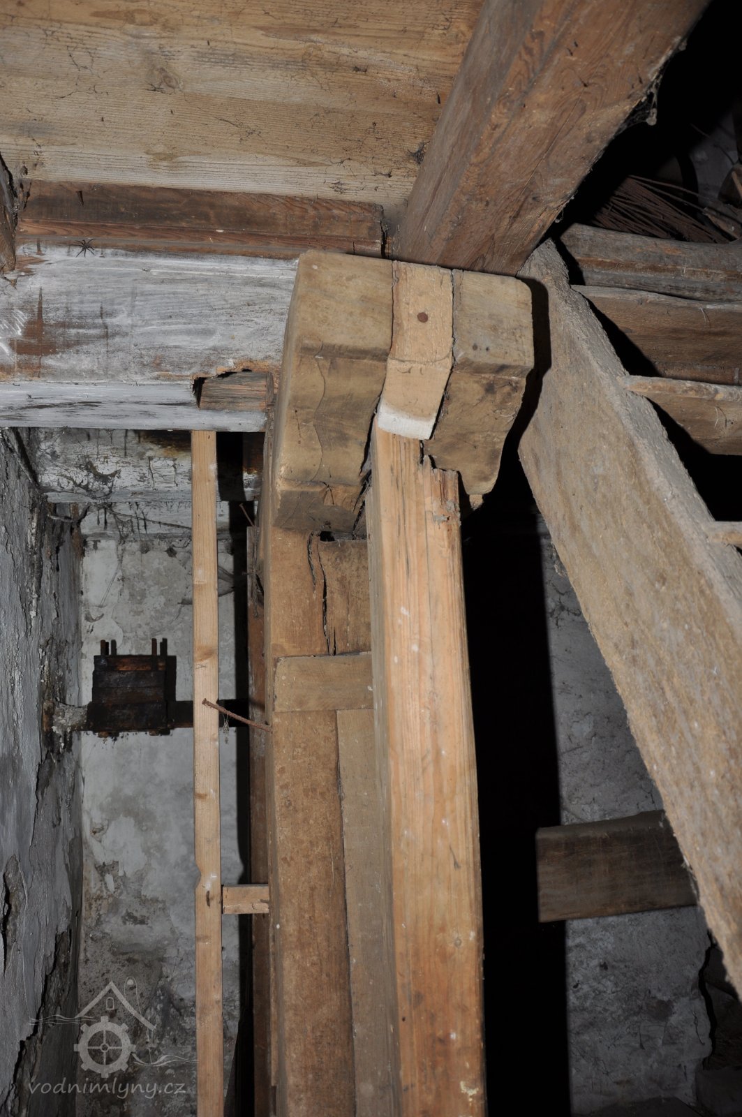 jeden ze sloupů mlýnské hranice a pozůstatek po spodní transmisi - kluzné ložisko konzolové s kroužkovým mazáním, 2015, © David Veverka, (Prvky na obrázku: transmise, řemenice, převody, mlýnská hranice)