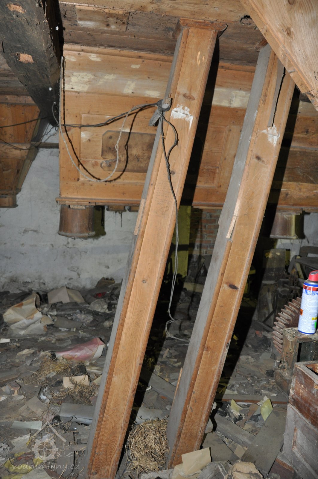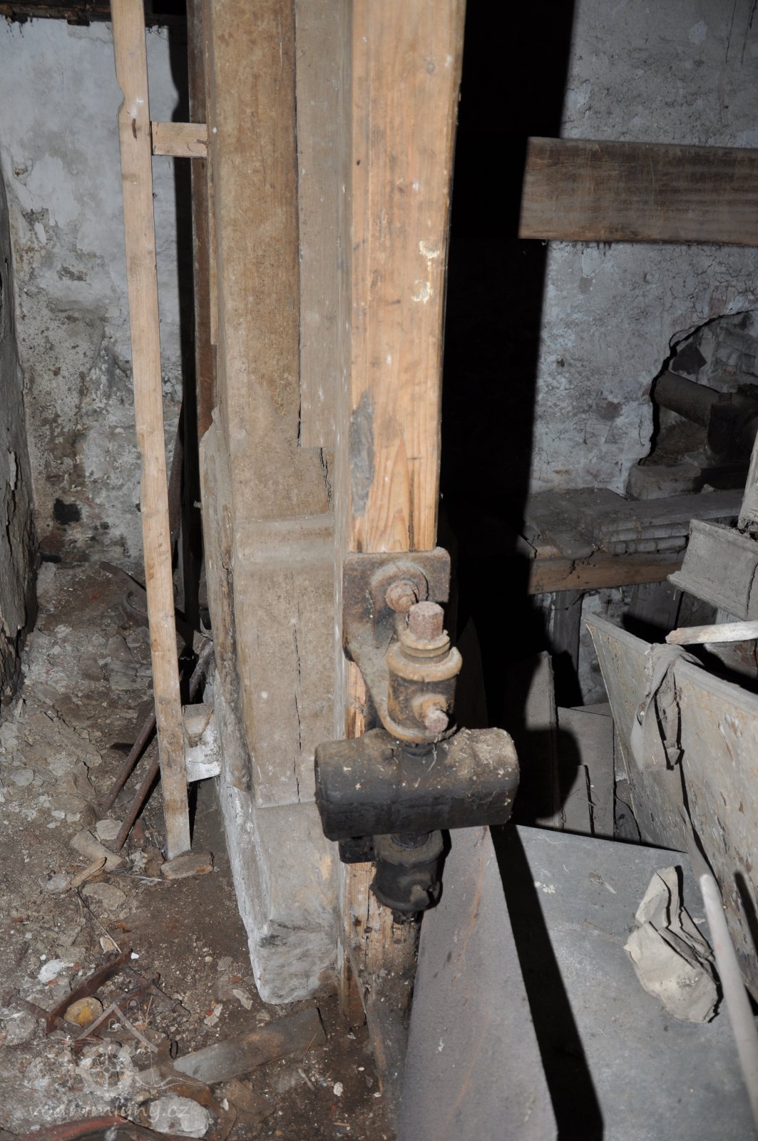 pohled do přízemí - spodních prostor mlýnice tzv. podkolí, 2015, © David Veverka, (Prvky na obrázku: transmise, řemenice, převody, mlýnská hranice)