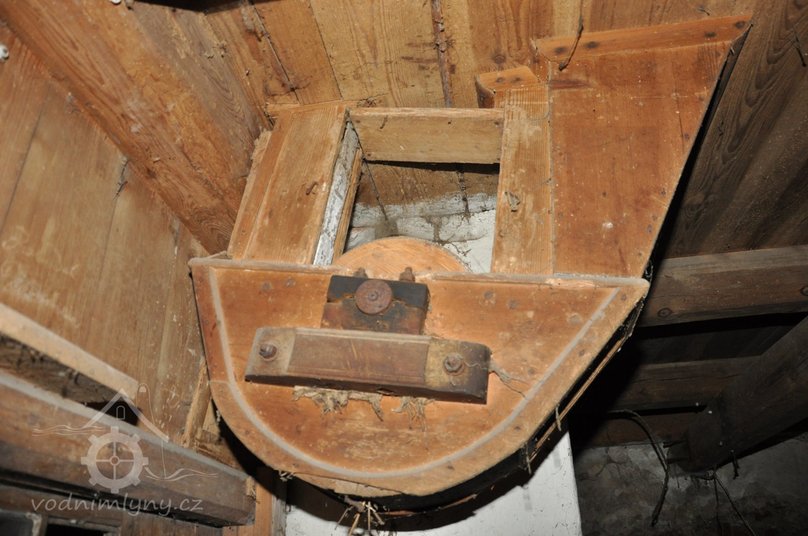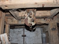 vodící rolny polozkříženého řemenového převodu k pohonu 1. kamenného mlecího složení, 2015, © David Veverka, (Prvky na obrázku: transmise, řemenice, převody)