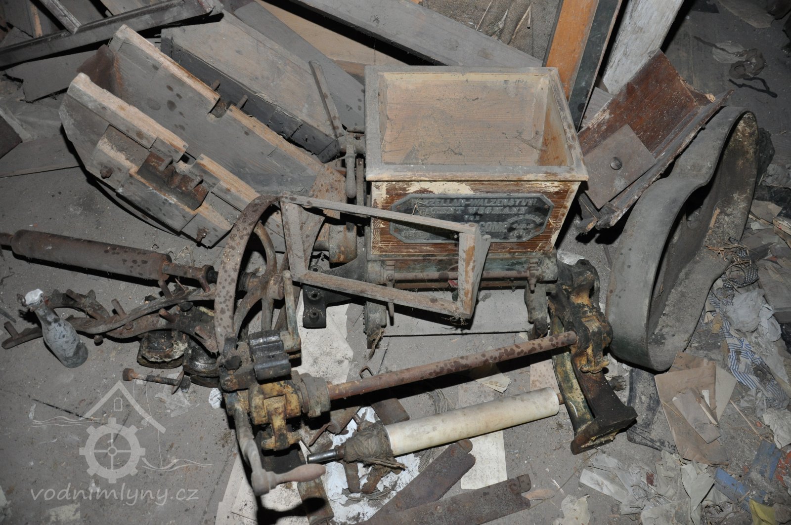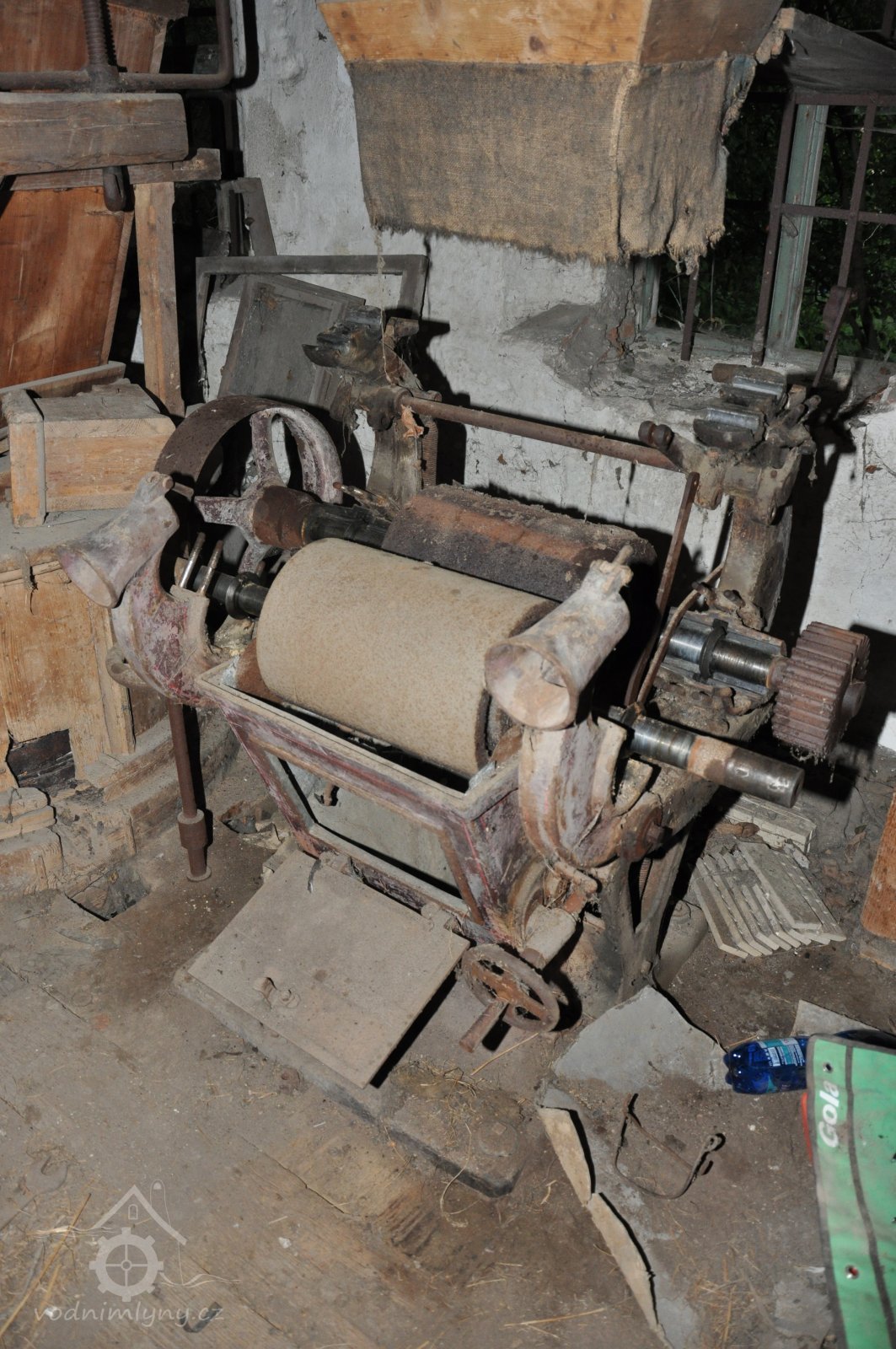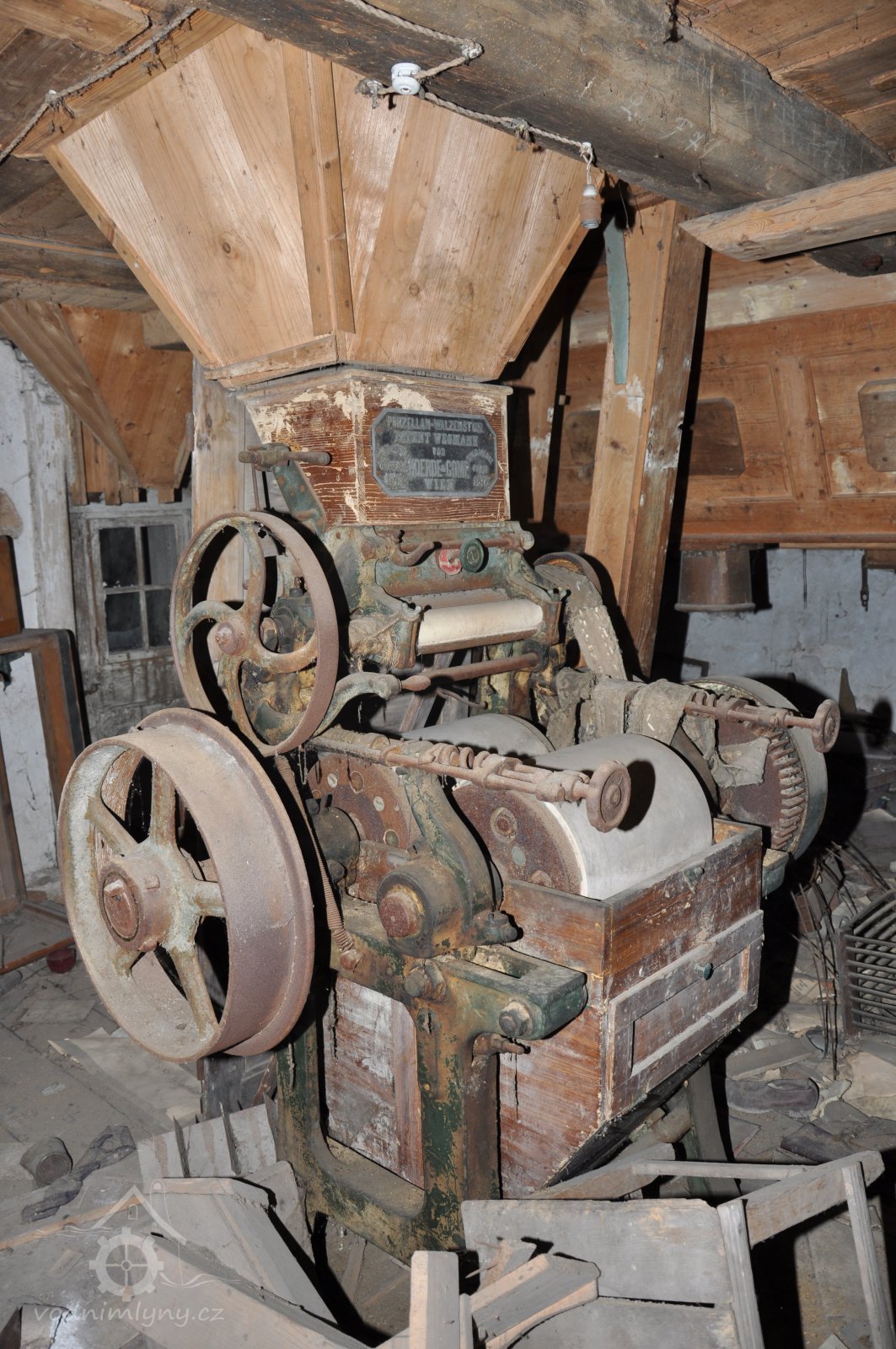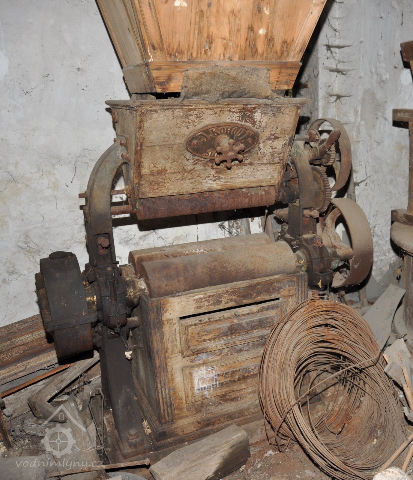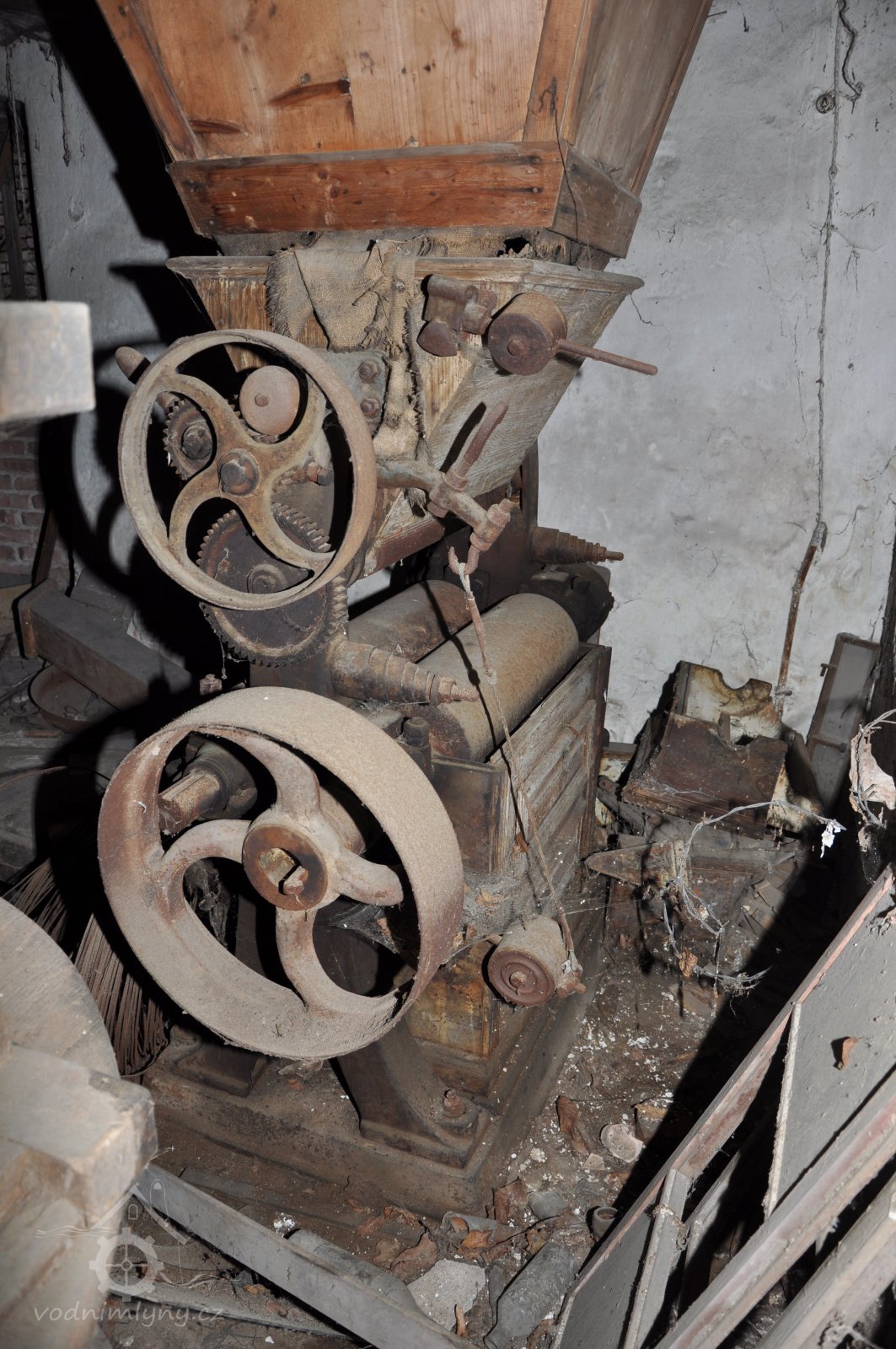 válcová stolice s rýhovanými válci v litinové skříni s plechovým krytem od výrobce Julius Škrlandt – České Budějovice, vyrobená kolem roku 1898, 2015, © David Veverka, (Prvky na obrázku: válcová stolice)