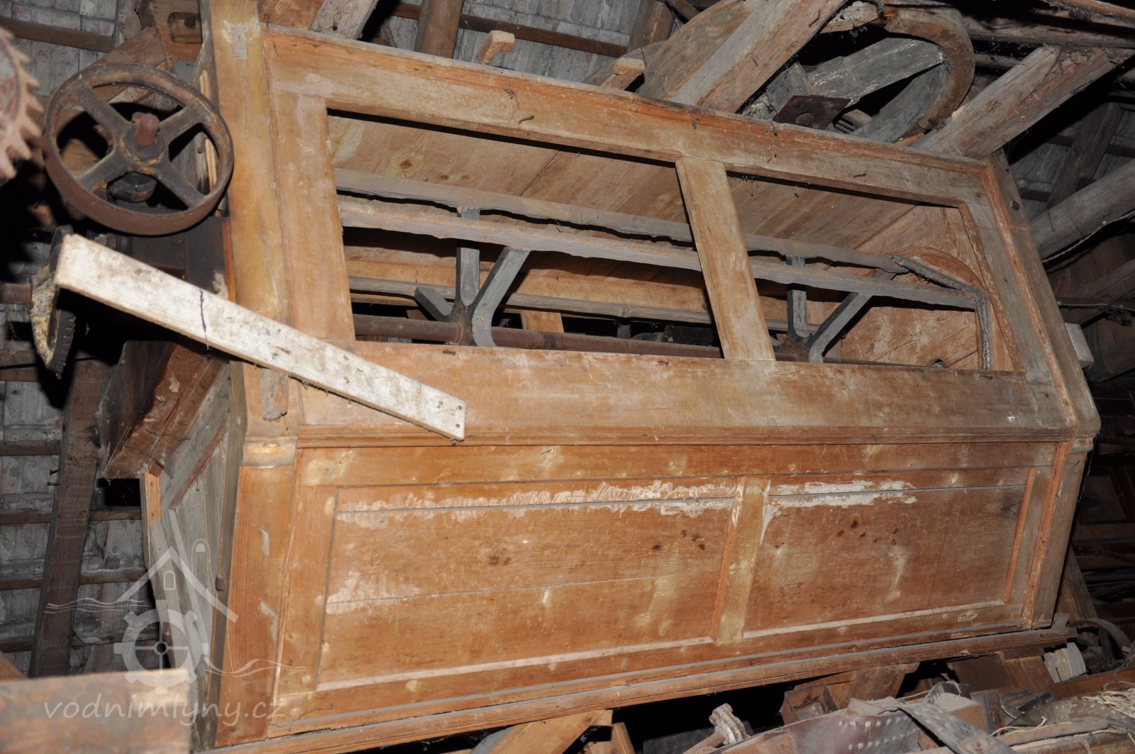 válcová stolice s rýhovanými válci v dřevěné skříni od výrobce J. Kohout – Praha Smíchov, vyrobená po roce 1888, 2015, © David Veverka, (Prvky na obrázku: válcová stolice)
