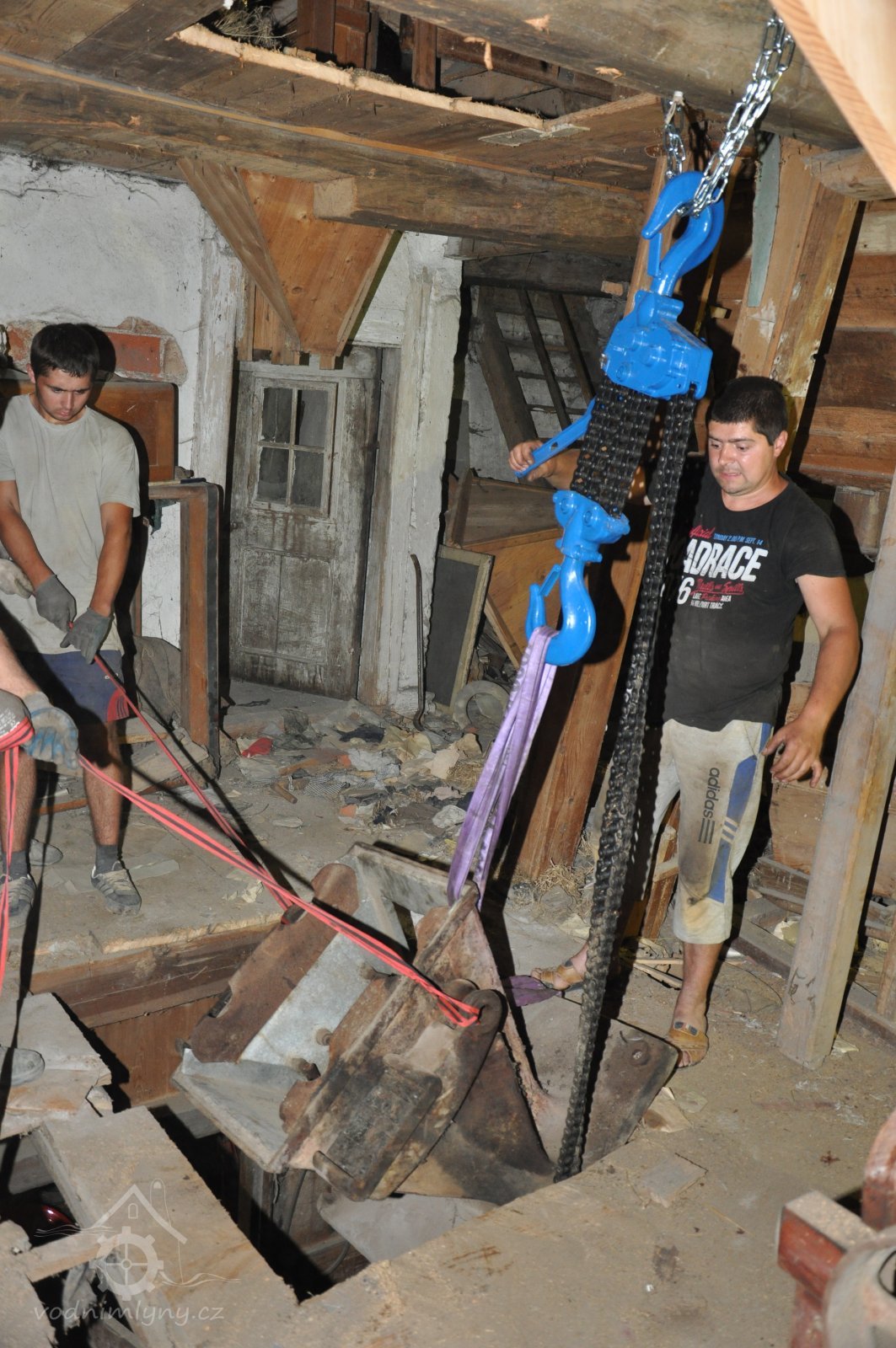 restaurátor strojů David Veverka provádí spouštění demontovaných částí strojního zařízení na řetězovém jeřábu pro převoz do muzejní expozice, 2015, © Anton