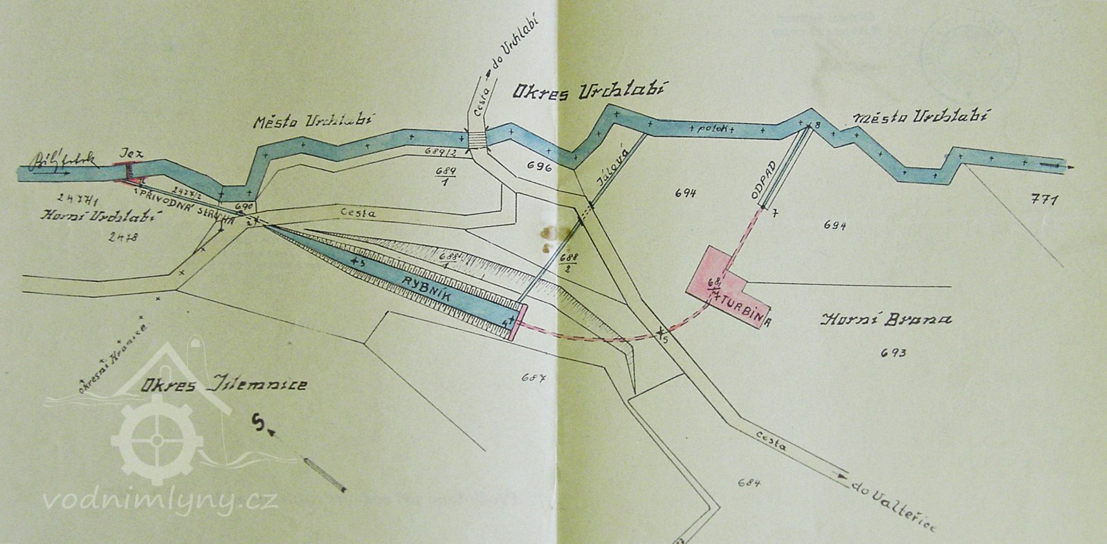 Mapa mlýna a rozsahu vodního díla, 1934, © Valentin Jaeggle (reprofoto SOkA Semily, Kolssteyn)