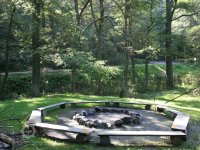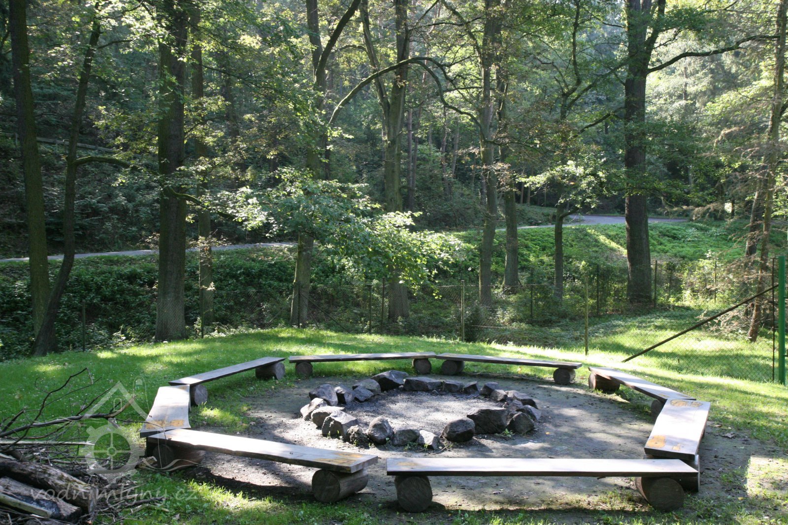 hřiště, velké ohniště, místnost na kola, parkoviště a molo