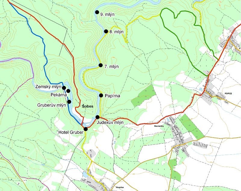 Názvy šesti mlýnů používané před II. světovou válkou: 1. Zemský mlýn, 2. Pekárna, 3. Gruberův mlýn, 4. Hotel Gruber, 5. Judexův mlýn a 6. Papírna.