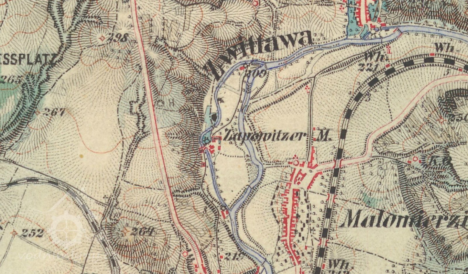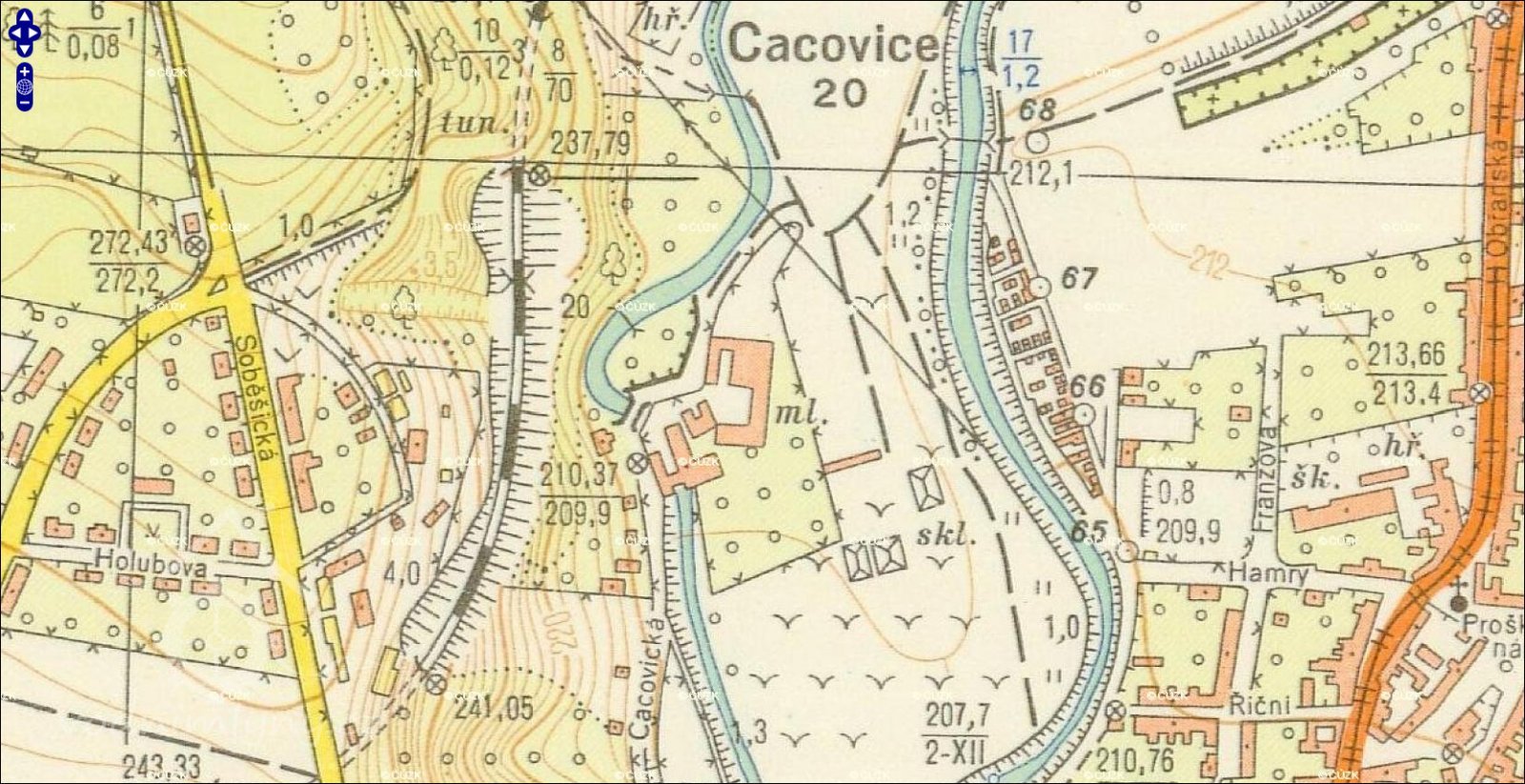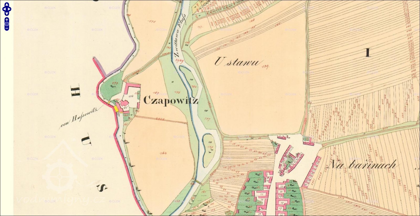 Pod mlýnem, mezi náhonem a silnicí, do Husovic vedoucí, až k tzv. "valše" a olejně, vlastnil mlynář pozemek, tzv. "ohražené".