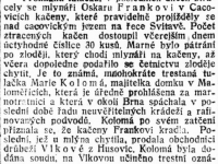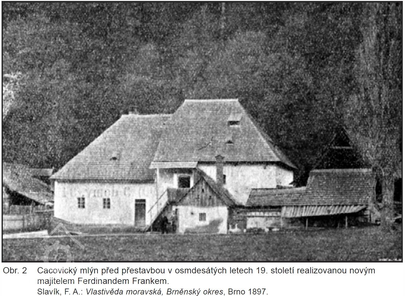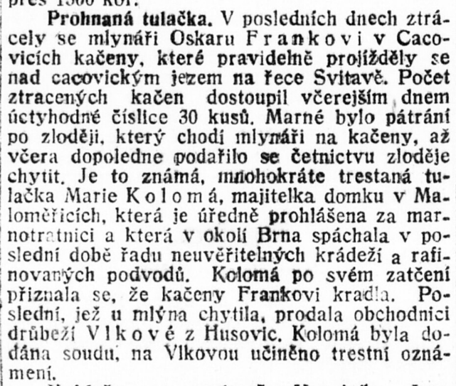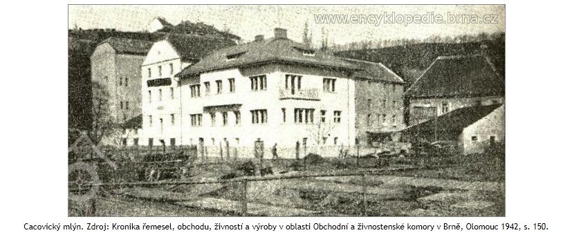 Nyní několik dalších dat o cacovském mlýně a to z článku, uveřejněného v listech r. 1903 pod nadpisem. "Strž vodního jezu v Cacovicích u Brna." Po tuhých mrazích v listopadu a prosinci r. l902 nastalým odměkem rozvodnila se řeka Svitava tou měrou, že pozvedla obrovské a silné kry a odnášejíc je na své hladině, mnoho mlýnů a jezů ve svém řečišti postavených, více méně poškodila. Neblahý osud ten potkal dne 28. prosince 1902 též jez u Maloměřic, náležející spolu s cacovským mlýnem panu Ferdinandu a Otýlii Frankovým. Ze starých listin, chovaných v cacovském mlýně, vyjímáme několik údajů splavu se týkajících. Postaven byl druhým majitelem mlýna, Eduardem Rybou na místě starého, za jara r. 1830 jarní vodou a kry urvaného. Prvým po vrchnosti majitelem mlýna a jezu byl Antonín Svoboda, který koupil mlýn s nějakým pozemkem, zahradou a vším mlýnským příslušenstvím podle inventáře od kláštera králové Sv. Marie Saal na Starém Brně. Od Ryby, vlastně jeho zástupců, koupil mlýn Josef Kottoweetz a od syna tohoto, Eduarda Kottowetze, r 1884 nynější majitelé Ferdinand a Otýlie Frankovi.