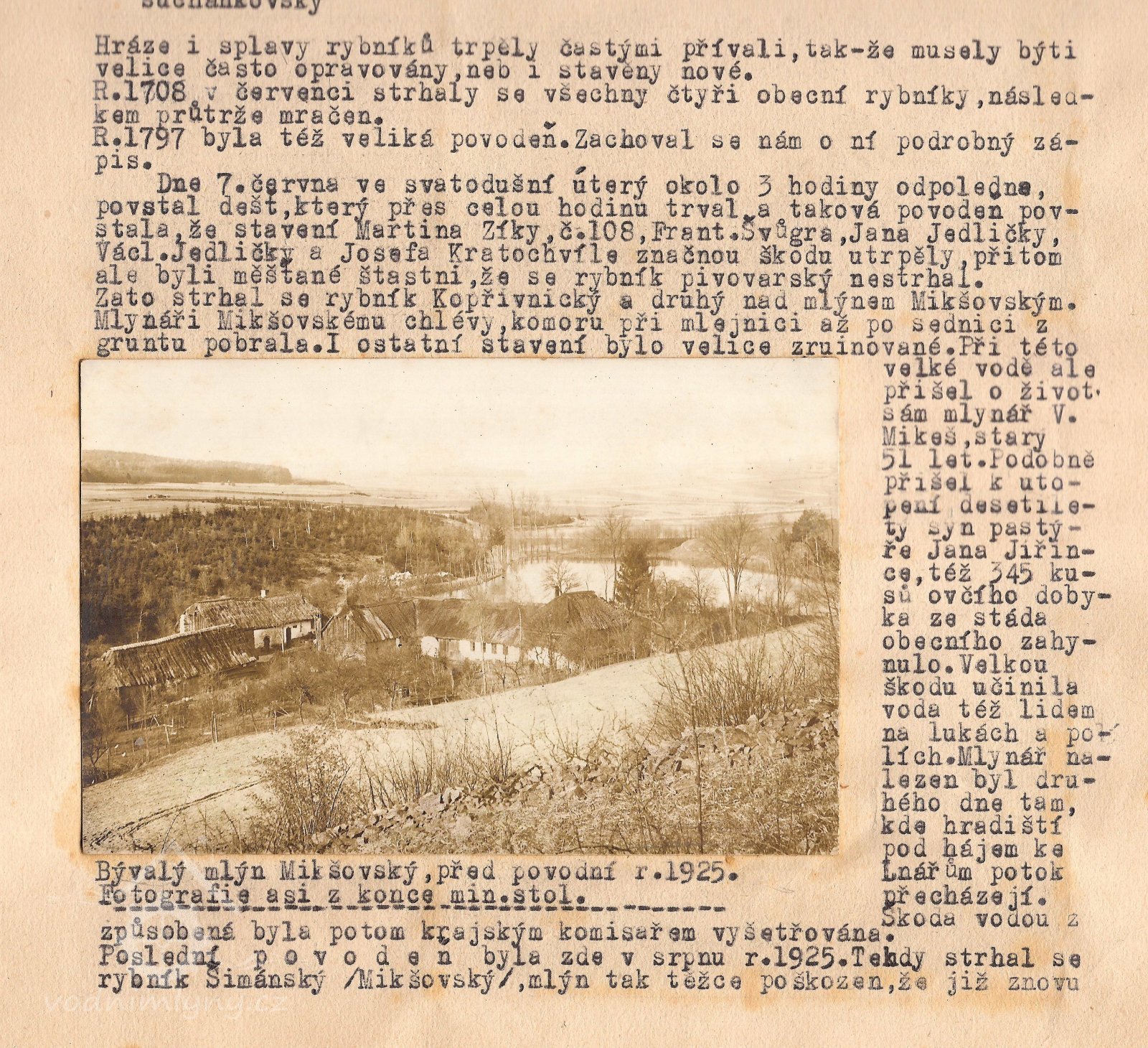 7.6.1797 po přívalovém dešti došlo k protržení mlýnského rybníka a těžkému poškození mýna, při této povodni zahynul i mlynář V. Mikeš, stár 51 roků. Podrobný popis povodně viz. Ikonografie - Ostatní.