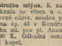 1916 exekuční dražba mlýna v odhadní ceně 39.689 K. Mlýn zakoupil Dr. Bedřich Jahn pro Annu Štulíkovou za 34.000 K. (RR)